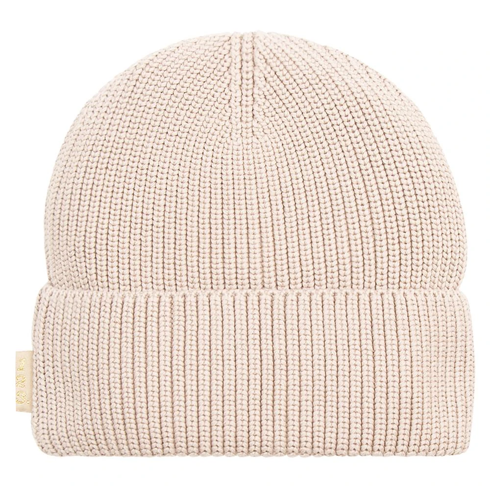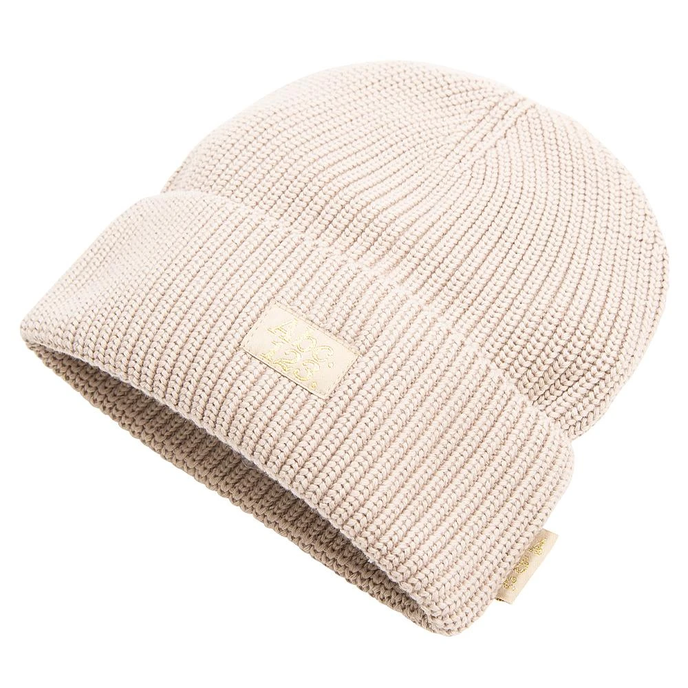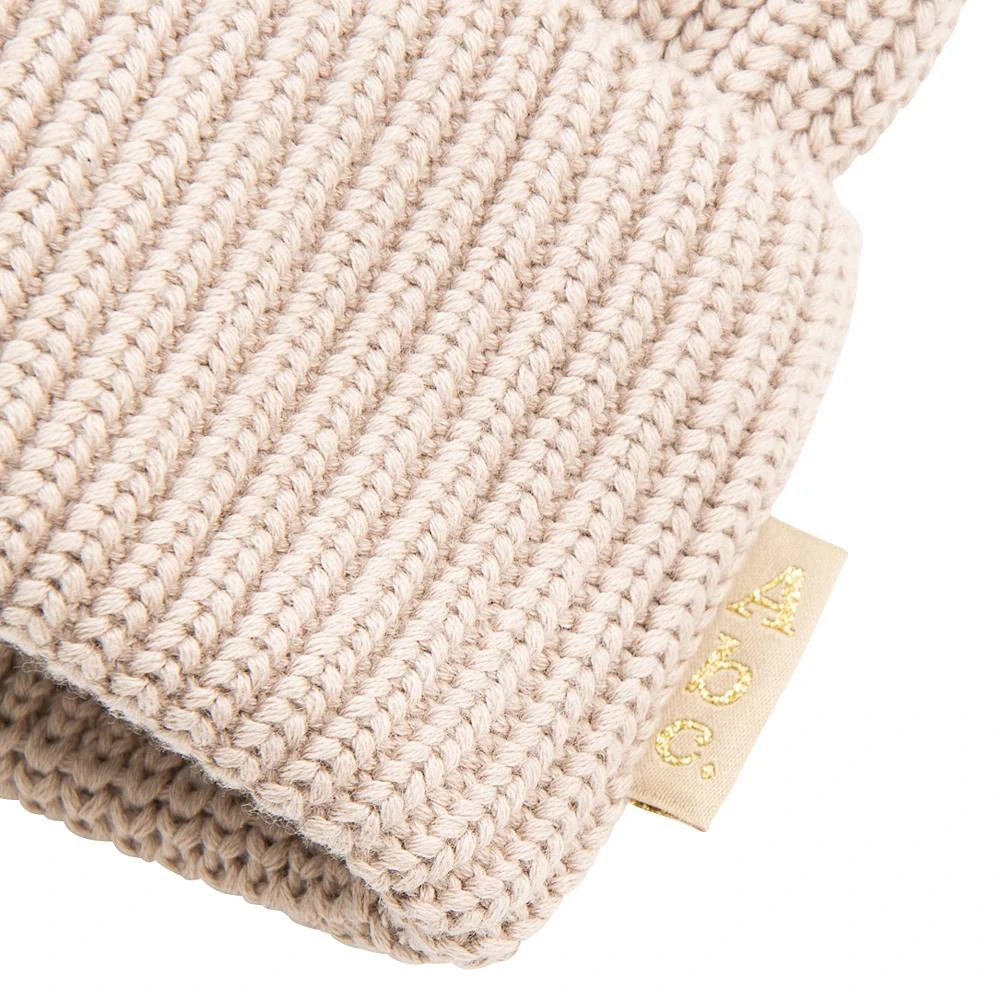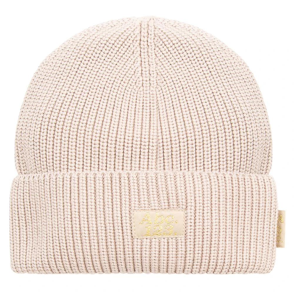 Ribbed beanie custom knit on Abc.123. fall-winter color palette. Features include tonal 100 denier damask woven Abc. 123. patch label and flag label with metallic gold thread, and interior main label w/ CLG code.