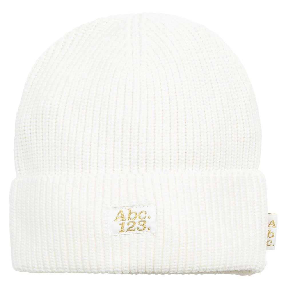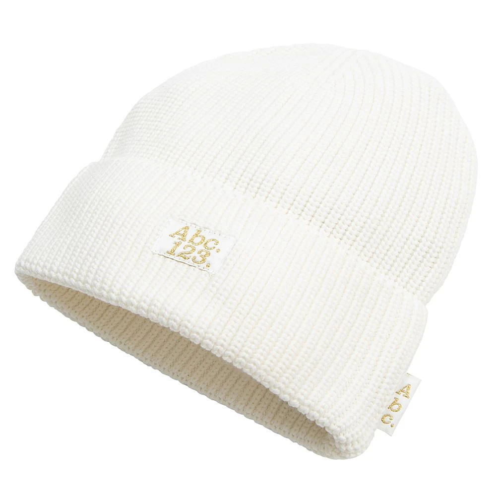 Ribbed beanie custom knit on Abc.123. fall-winter color palette. Features include tonal 100 denier damask woven Abc. 123. patch label and flag label with metallic gold thread, and interior main label w/ CLG code.