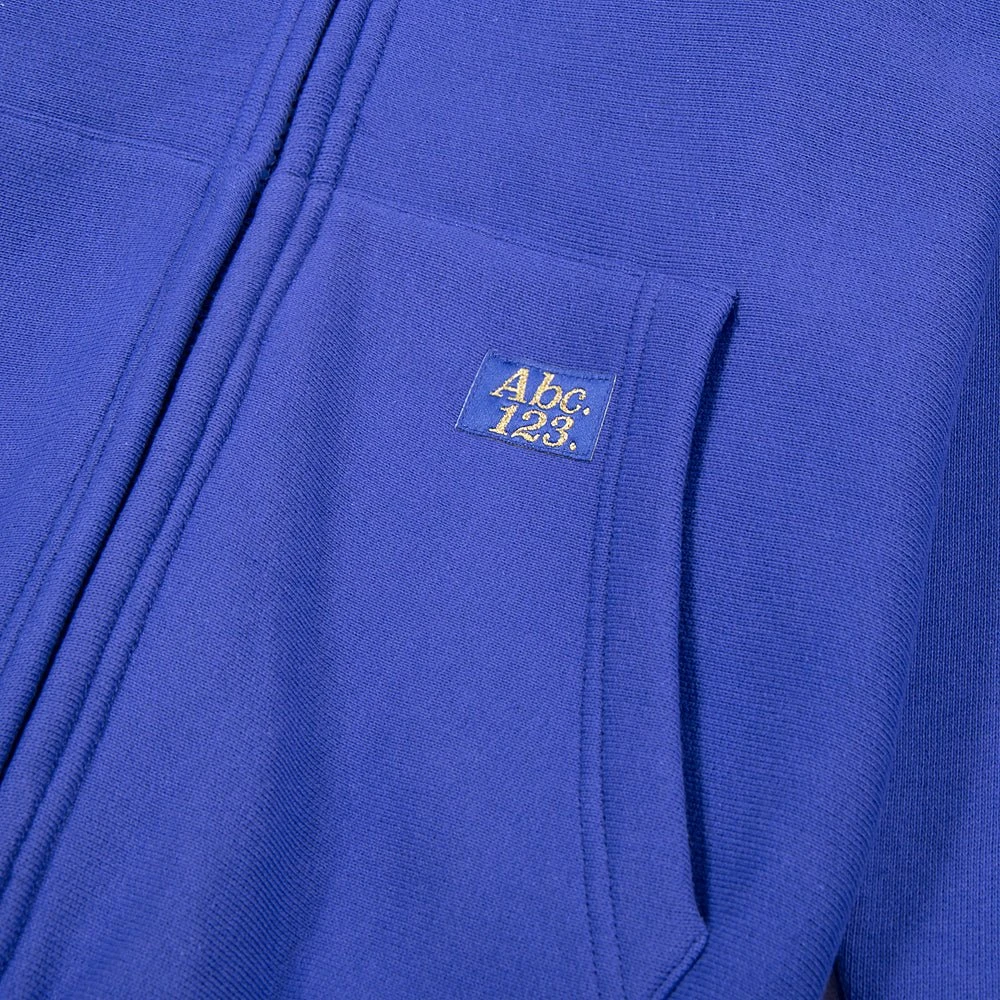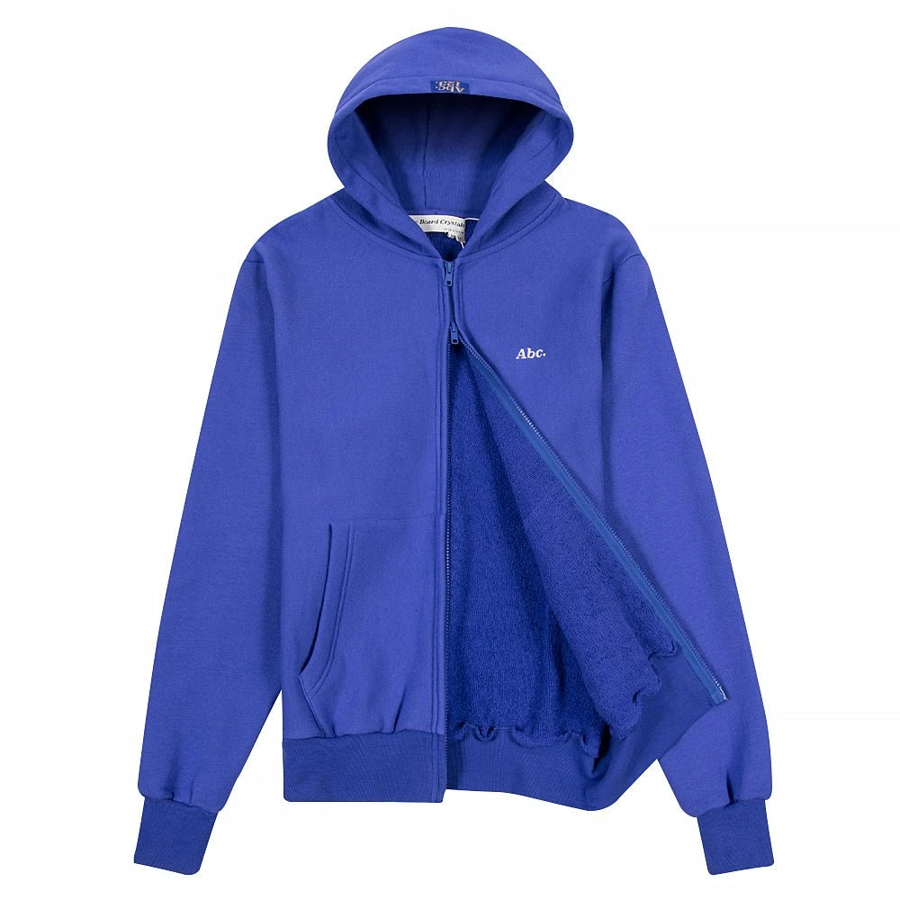 Lightweight double zipper hooded sweatshirt in our signature proprietary custom milled rib and french terry fabrication. Features include Abc. Ecru pull-tab, ecru chainstitch embroidered Abc. on chest, tonal double zipper, 2 tonal 100 denier damask woven Abc. 123. patch label and flag label with metallic gold thread, and front kangaroo pocket.