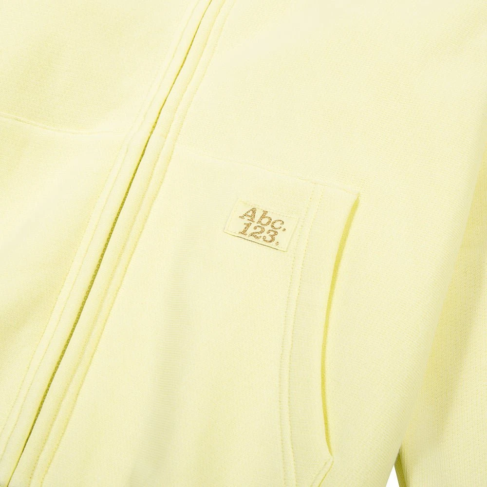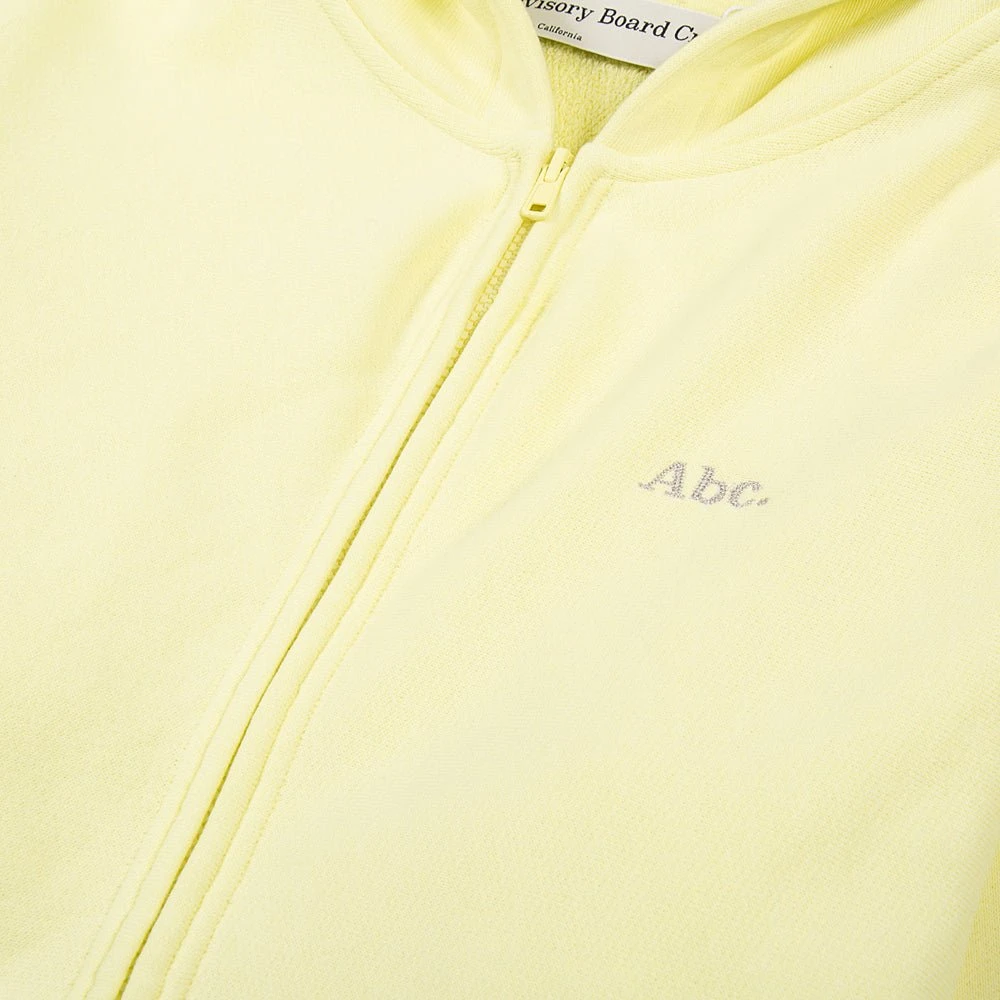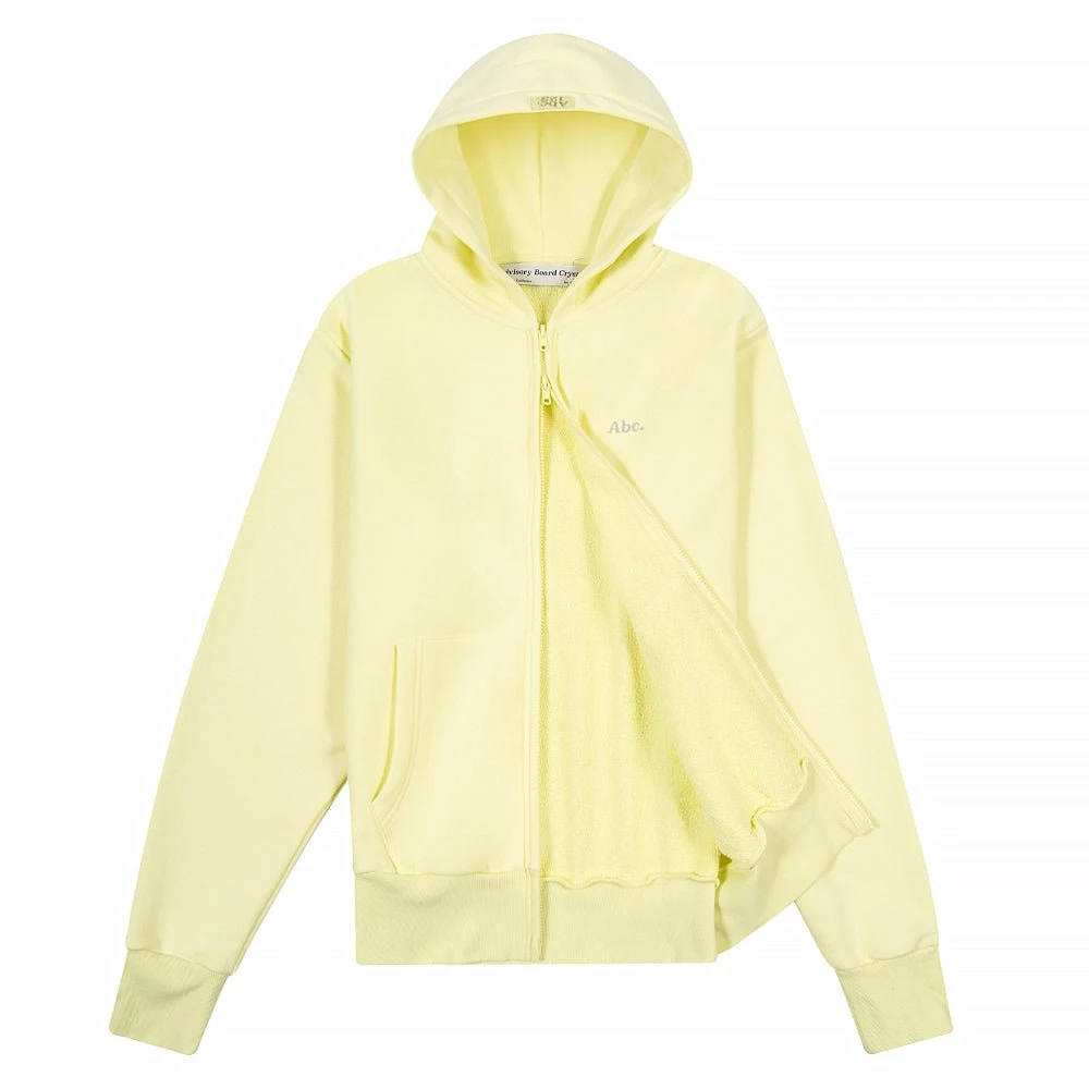 Lightweight double zipper hooded sweatshirt in our signature proprietary custom milled rib and french terry fabrication. Features include Abc. Ecru pull-tab, ecru chainstitch embroidered Abc. on chest, tonal double zipper, 2 tonal 100 denier damask woven Abc. 123. patch label and flag label with metallic gold thread, and front kangaroo pocket.