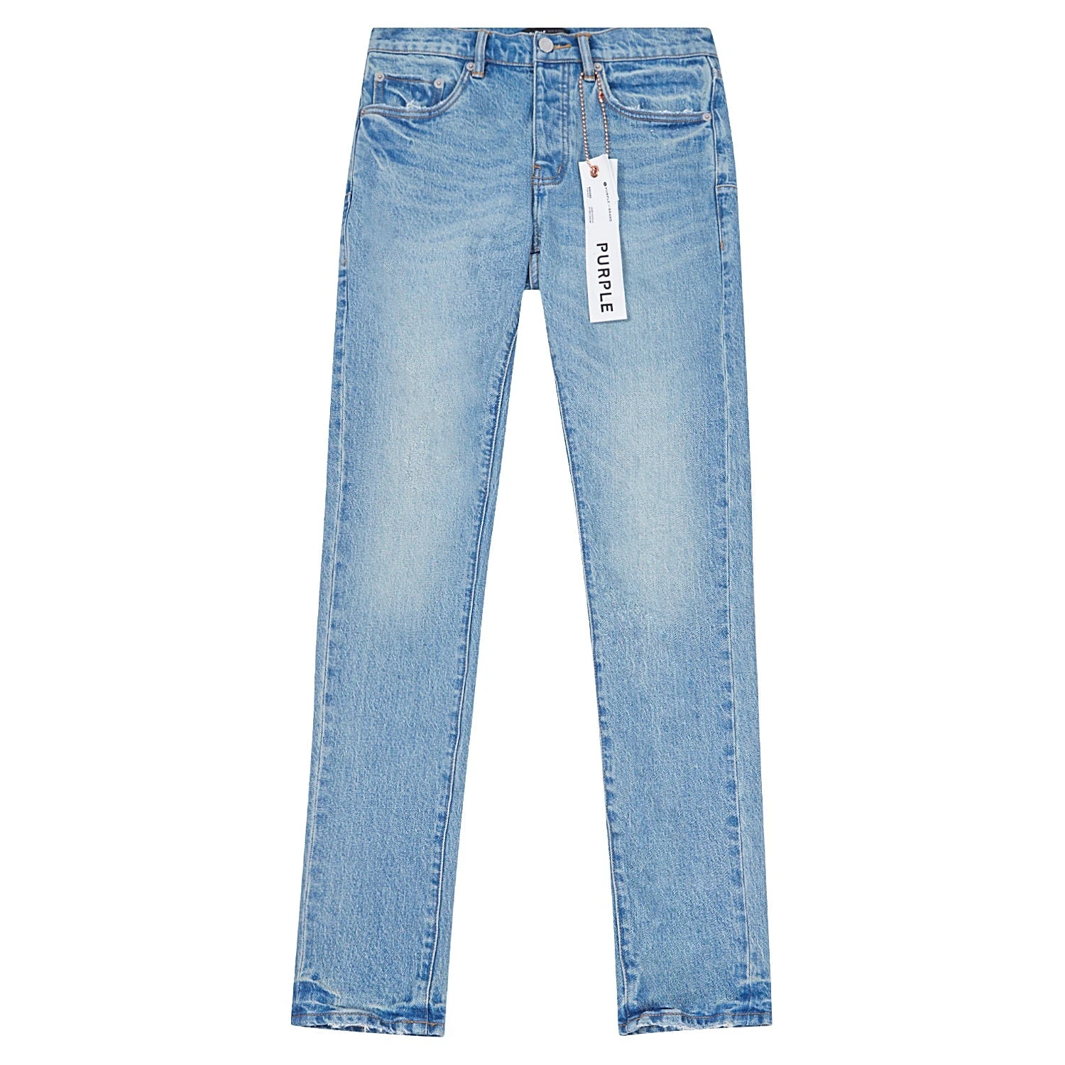 Crafted from light indigo stretch denim with worn thighs, this 90’S-inspired low rise skinny features five pocket styling, reinforced belt loops, bar-tack stitching, chambray lining for a more comfortable fit, a custom Purple cowhide leather patch and signature hang tag branding.