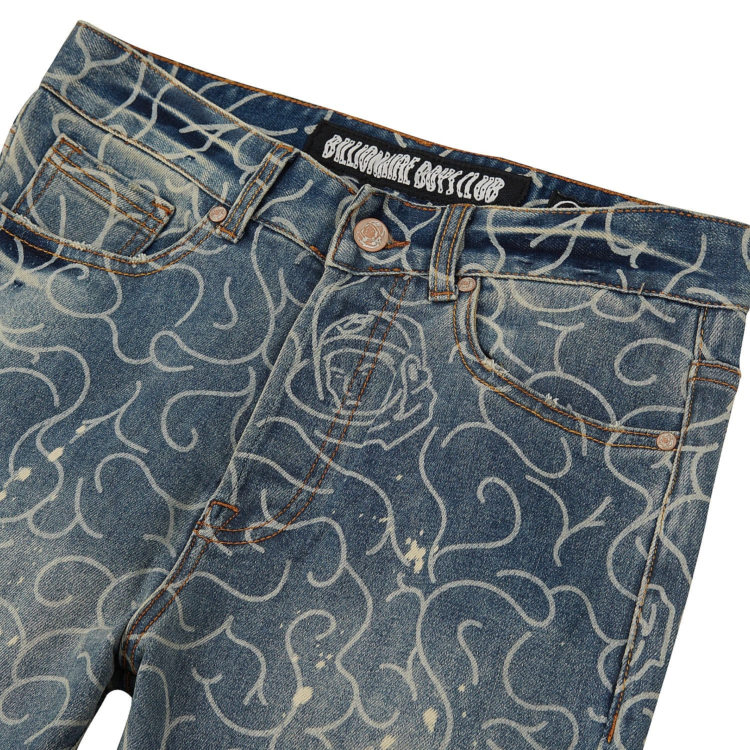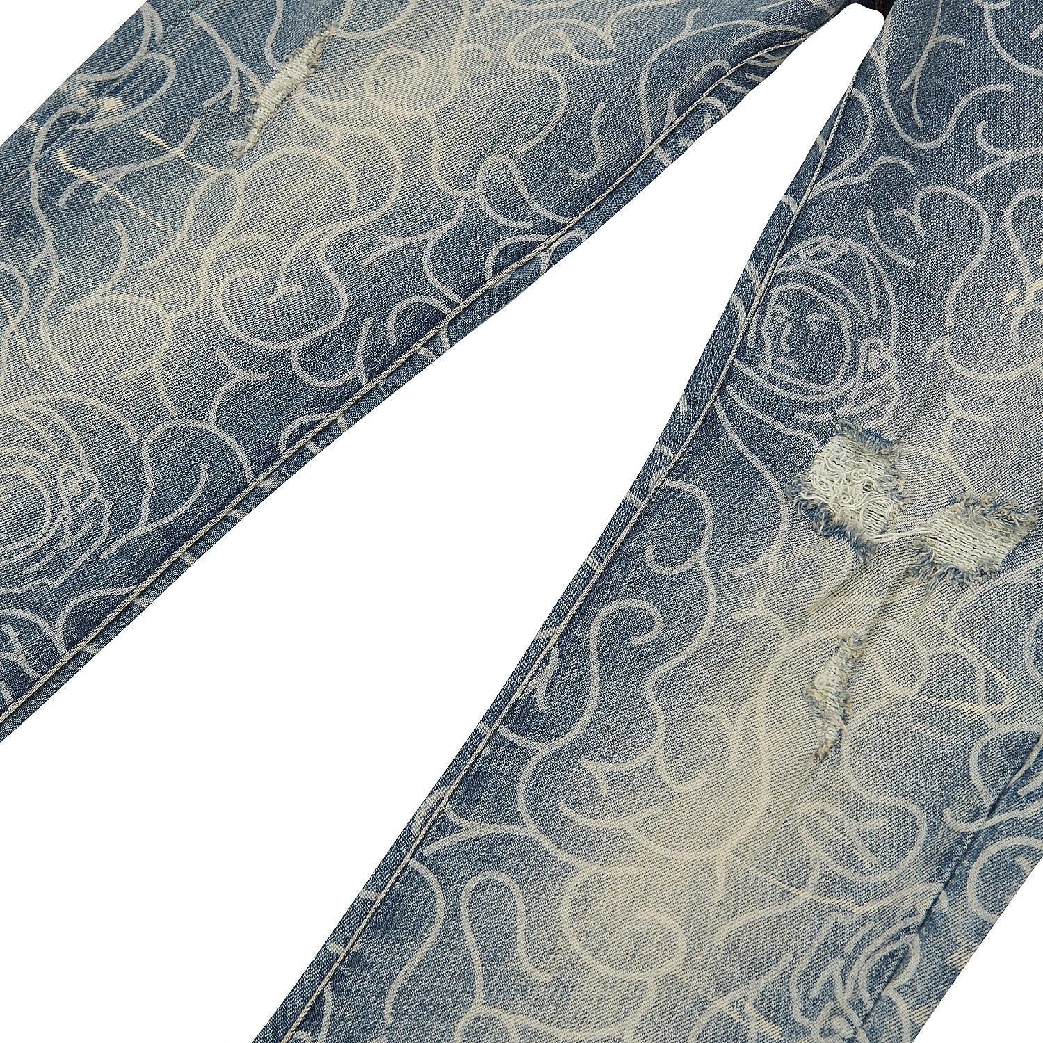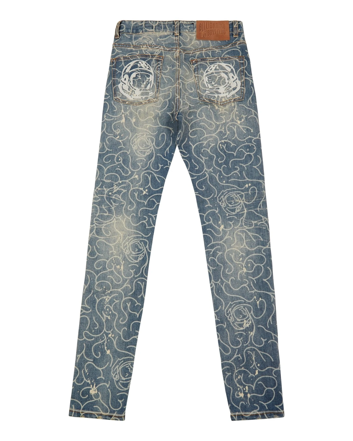 Low-stretch denim defines slim-fit jeans detailed with bold graphics and threadbare distressing.