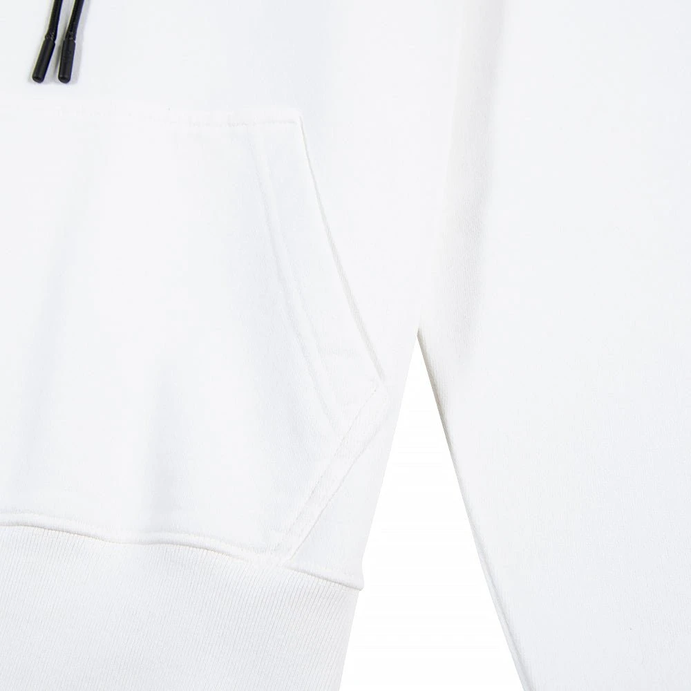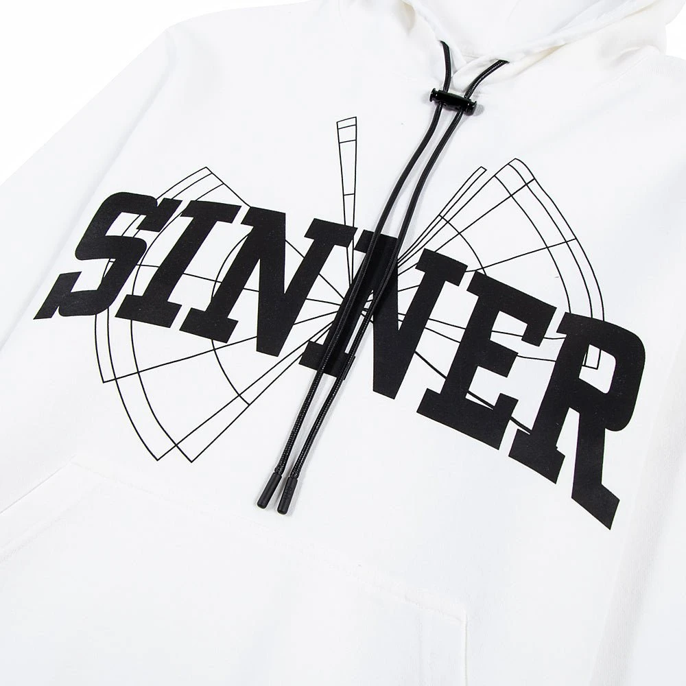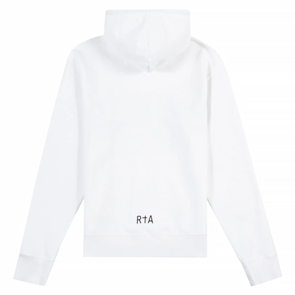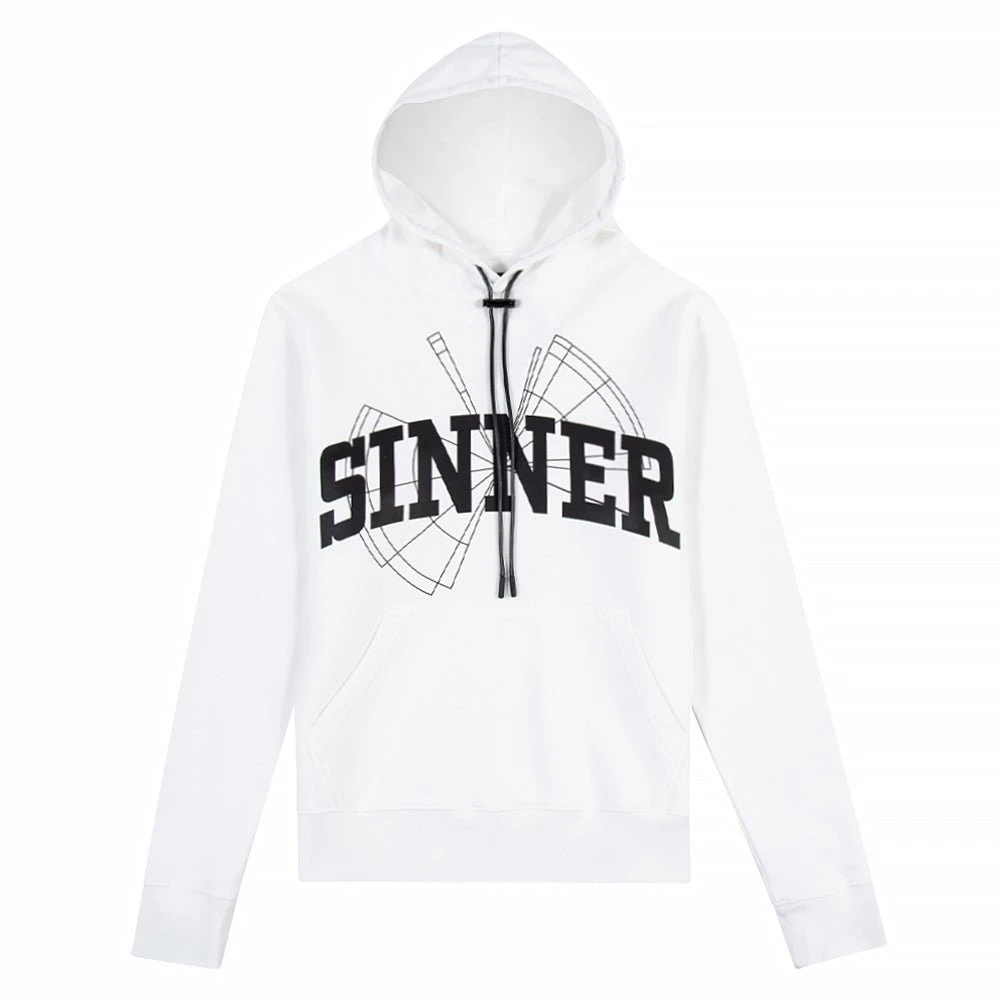 The RtA Sinner Hoodie is a white cotton hoodie with a large “SINNER” graphic and scanner graphic print on the front. The top is finished with coated drawstrings and an engraved aglet.