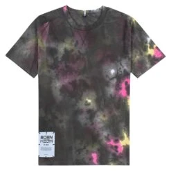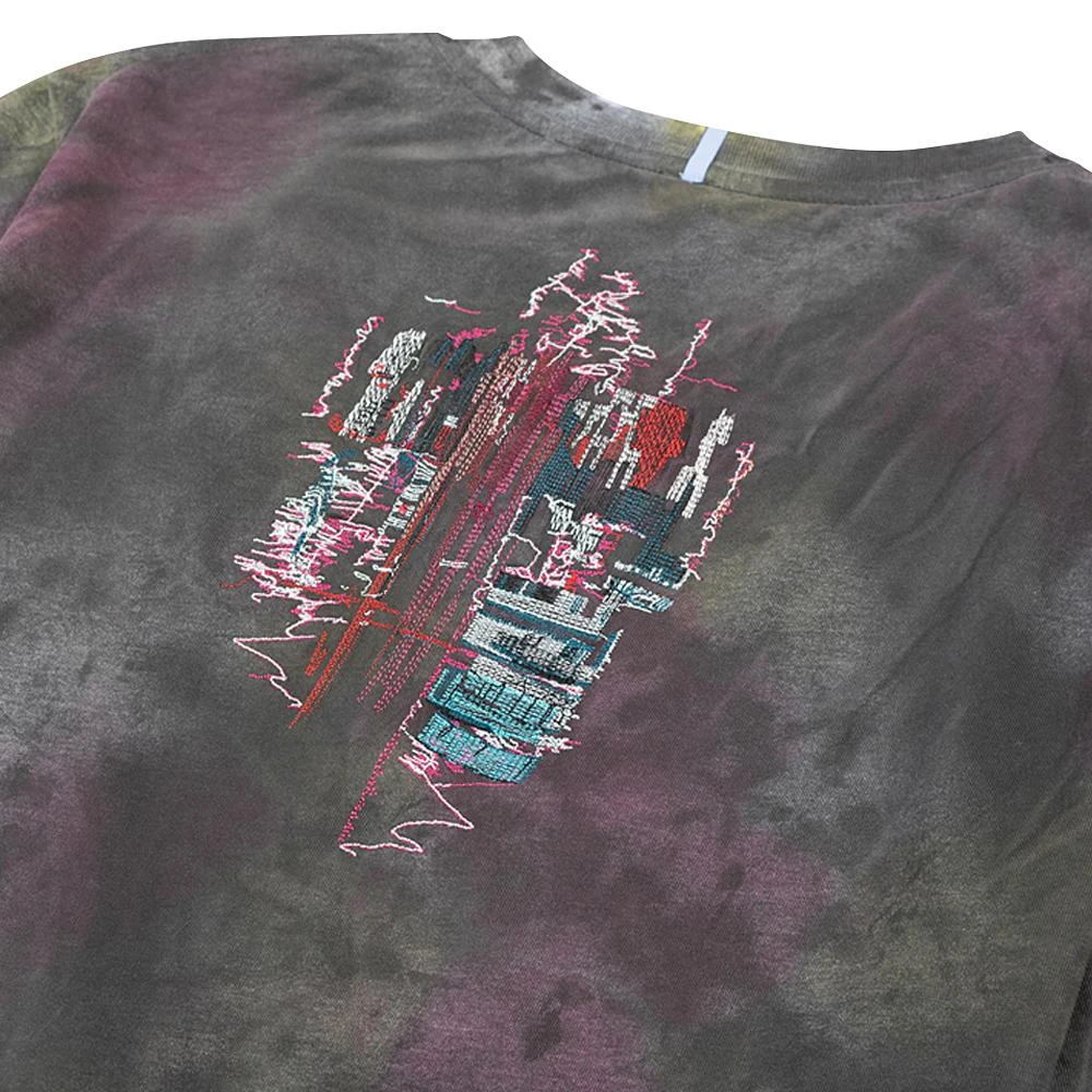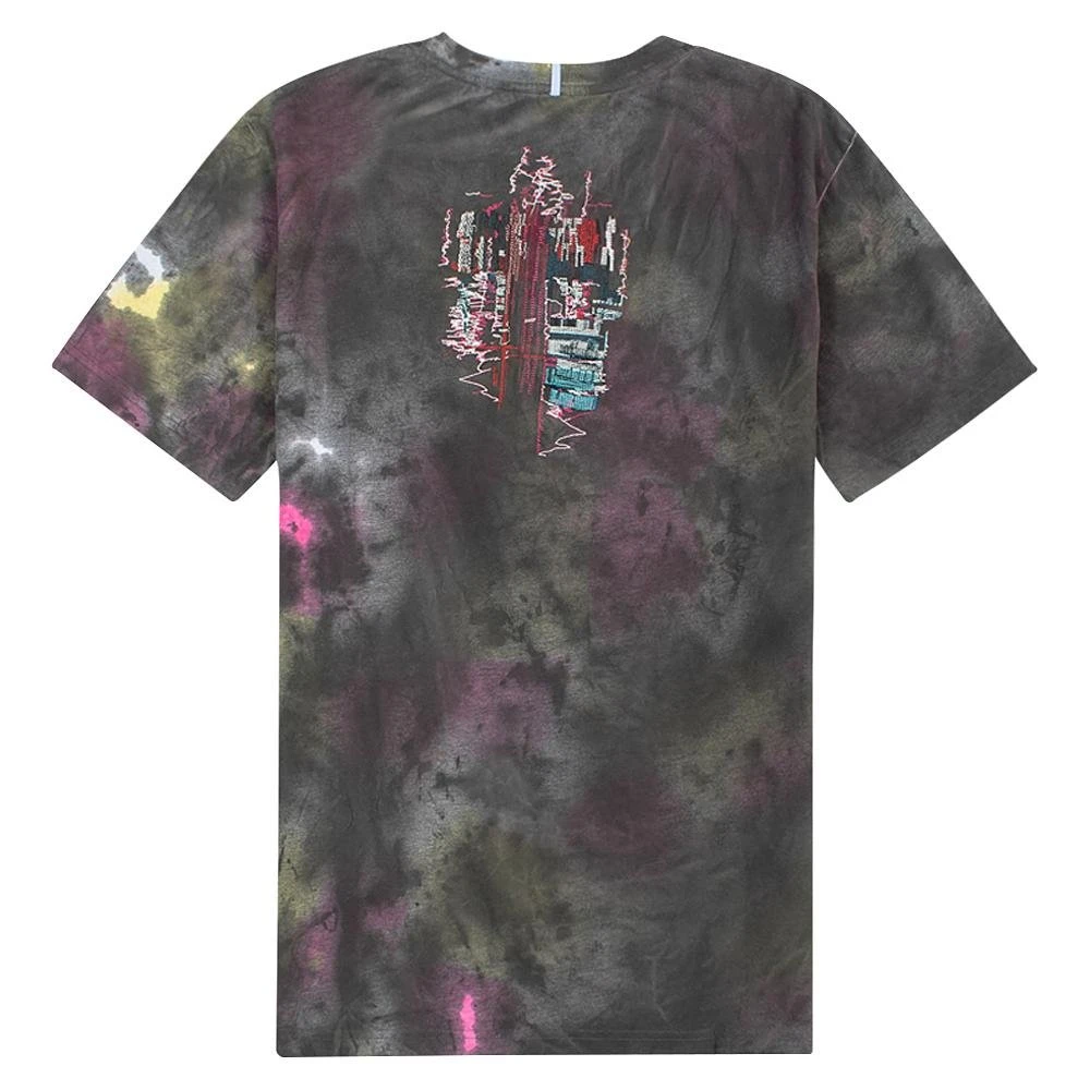 Short sleeve cotton jersey T-shirt in black featuring tie-dye effect in multicolor throughout. Fading throughout. Rib knit crewneck collar. Textile logo patch in purple at front hem. Dropped shoulders. Textile flag in purple at back collar. Graphic embroidered in multicolor at back.