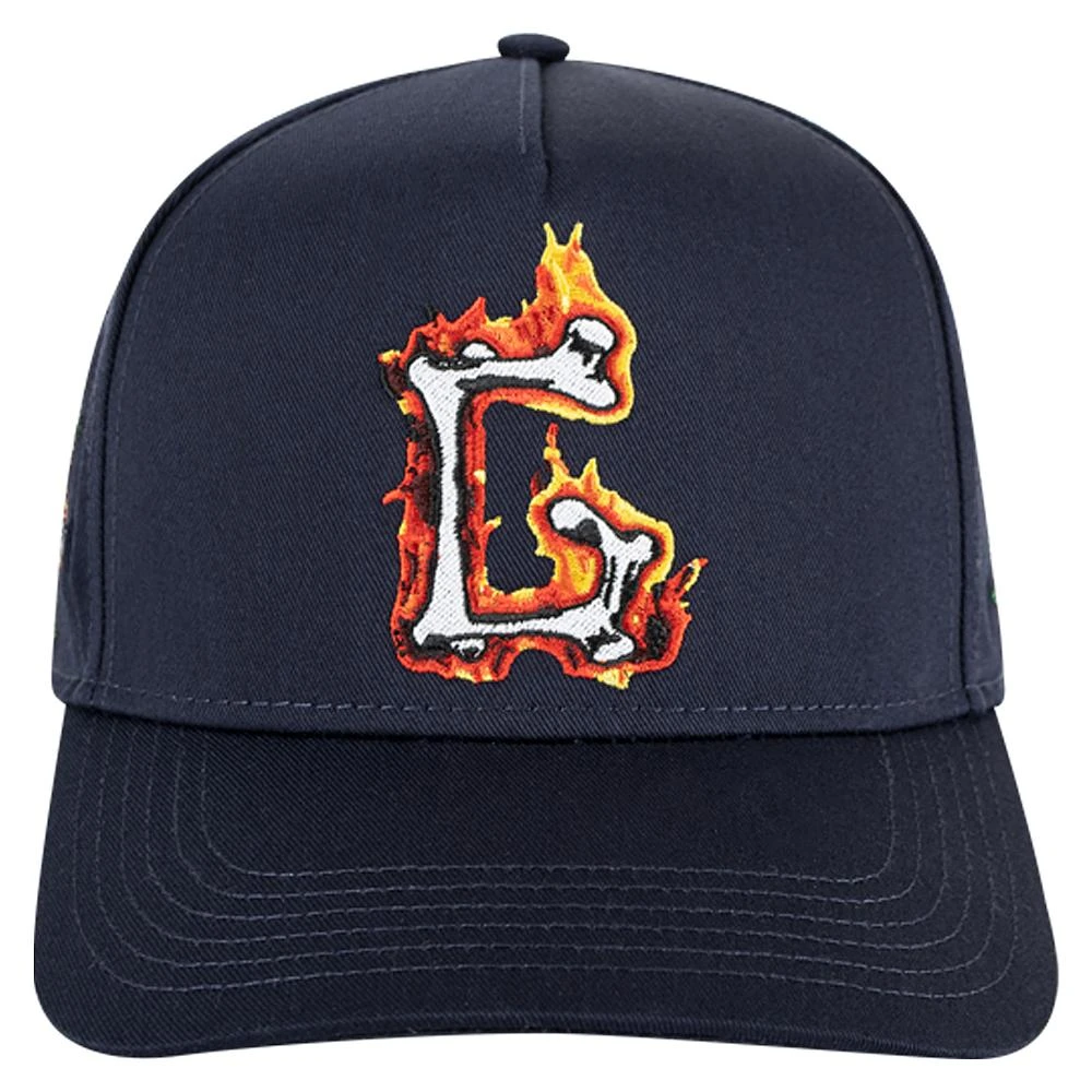 Trucker hat with embroidery G logo on the front, flaming skull, and roses logo on each side, and Gifts of Fortune logo on the back.
