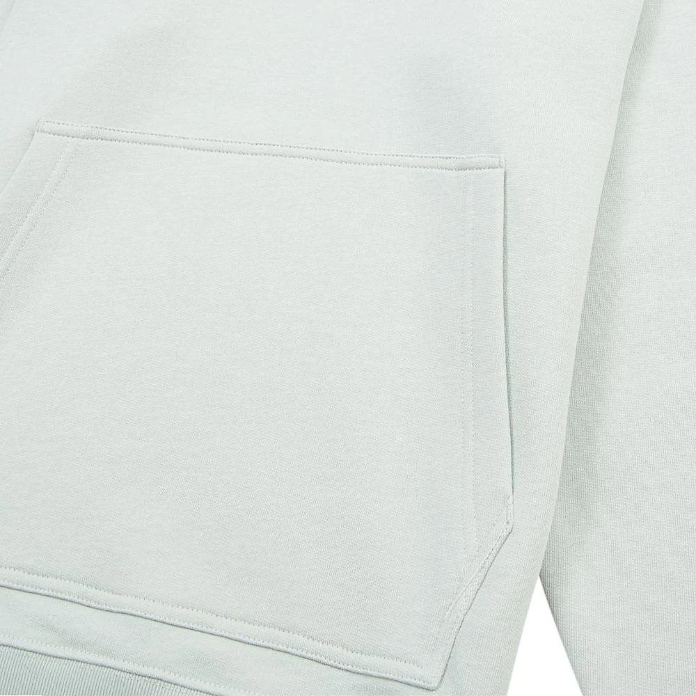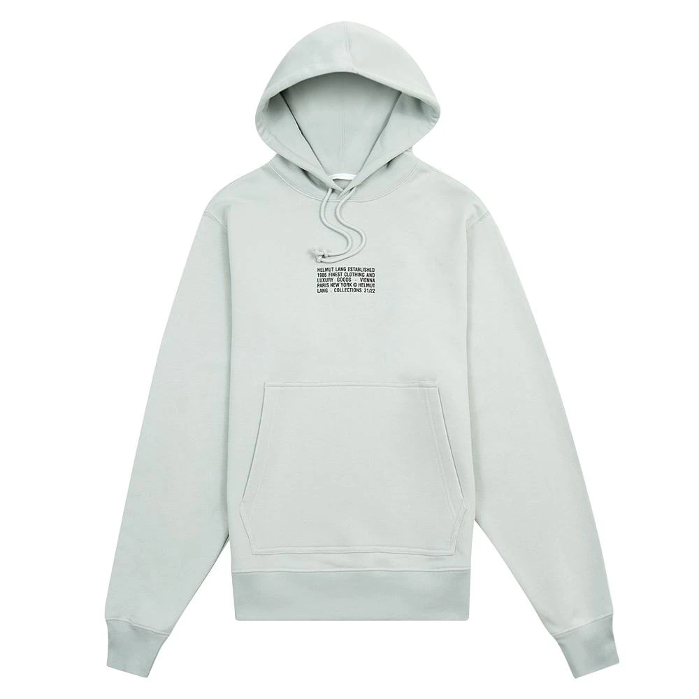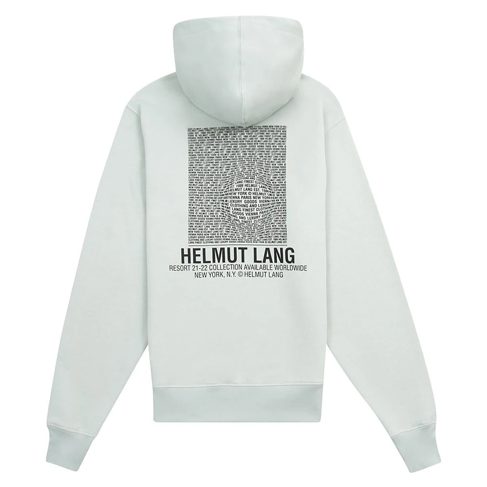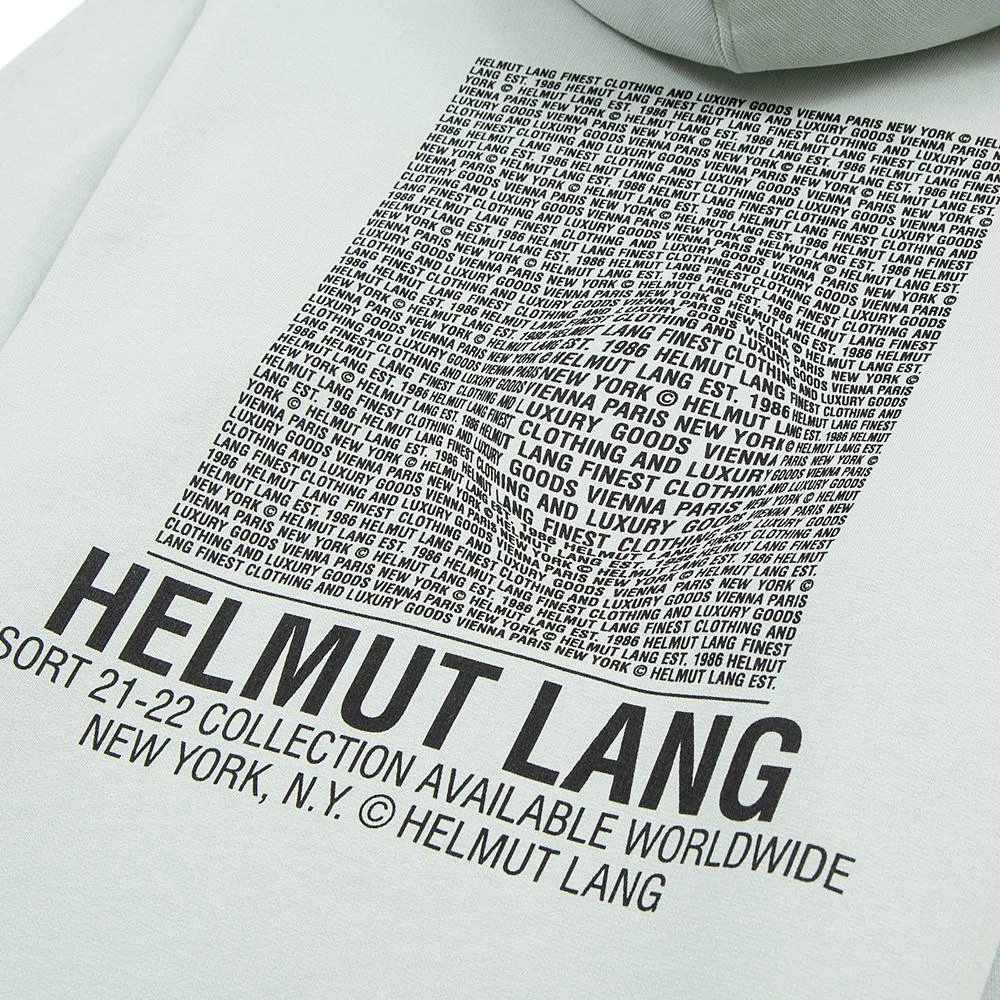 The Helmut Lang Distort Hoodie is a terry cotton sweatshirt with a drawstring hood, kangaroo front pocket, and graphic text details.