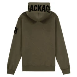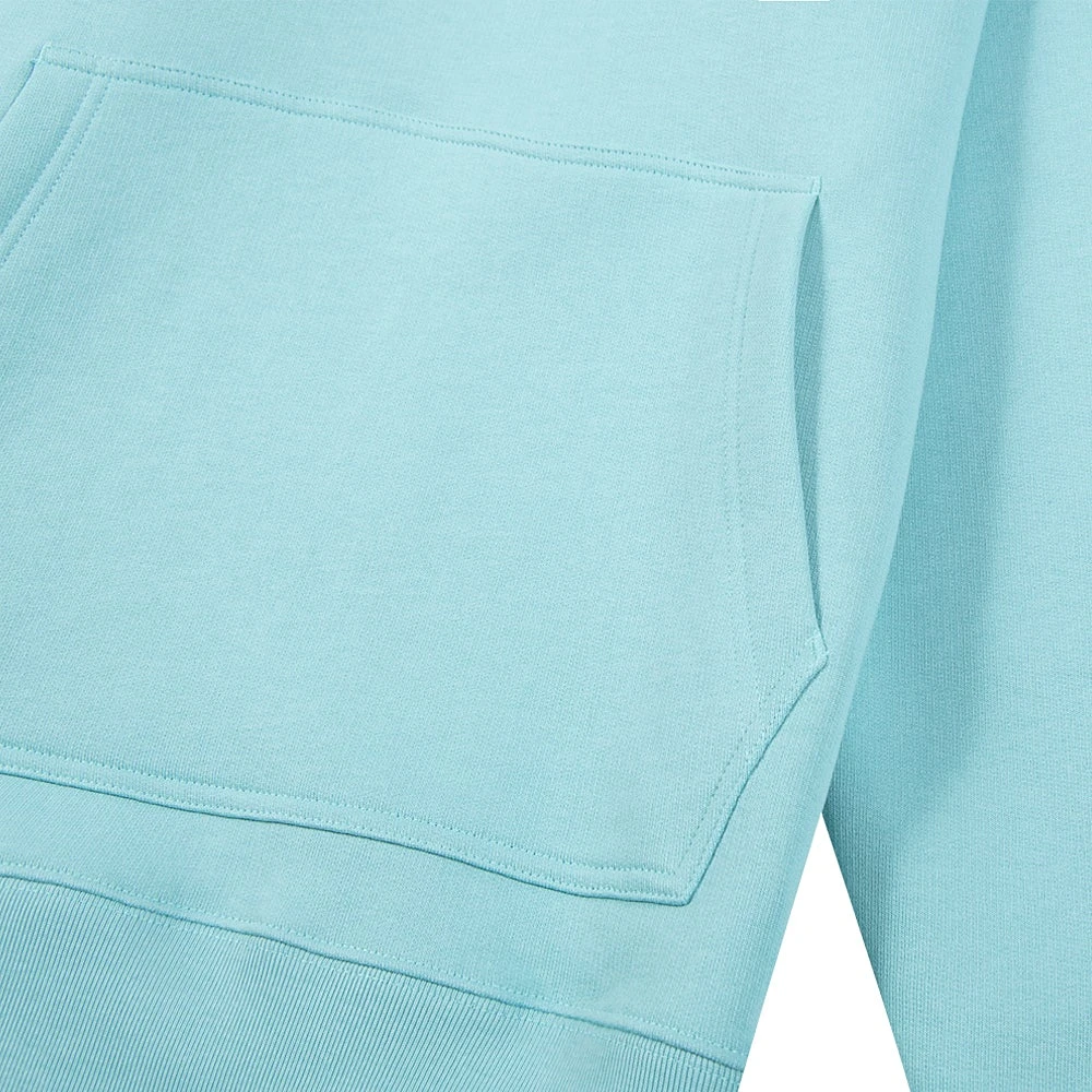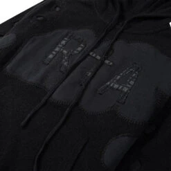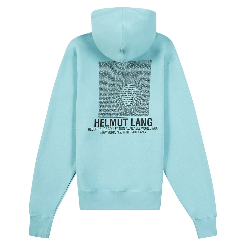 The Helmut Lang Distort Hoodie is a terry cotton sweatshirt with a drawstring hood, kangaroo front pocket, and graphic text details.