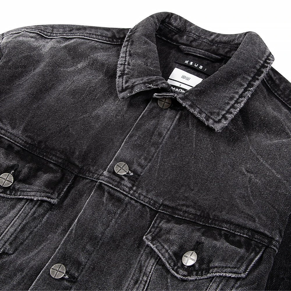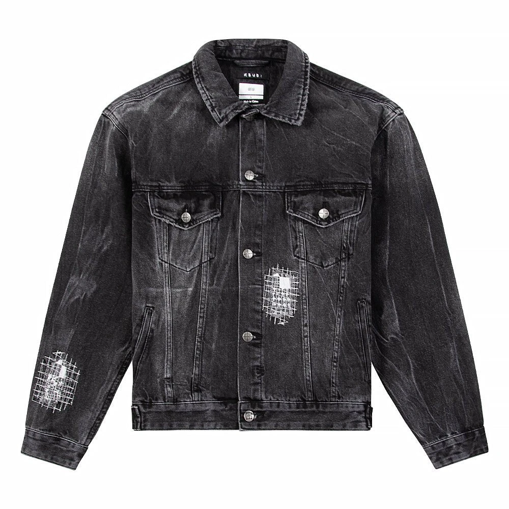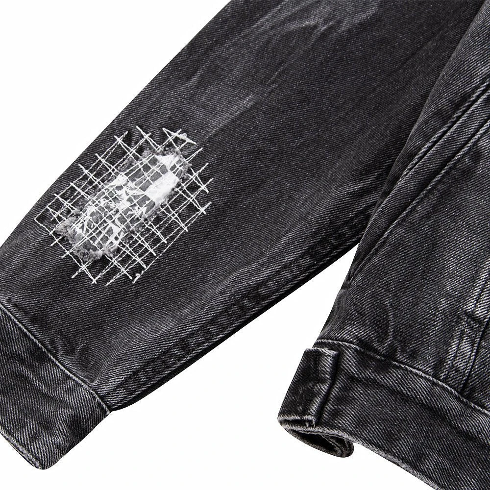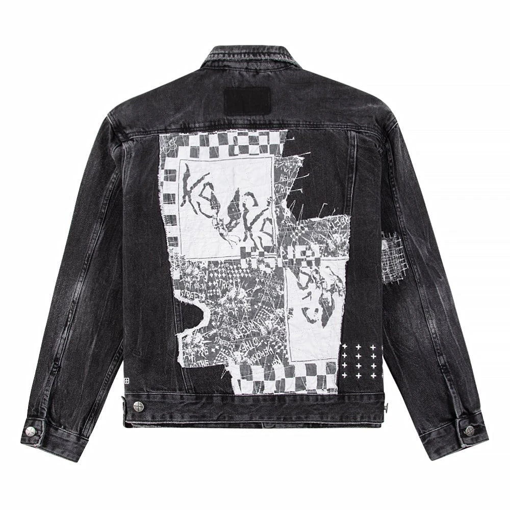The Oh G Jacket Streets features distressed repair patches on the front and back, light grinding, 4×4 cross embroidery on the back, printed t-box and branded hardware. This button through trucker jacket is constructed from a premium rigid denim in a faded black wash. Designed as an oversized jacket, this style has branded hardware and four pockets. Match with the ‘Chitch Streets for a full denim on denim look.