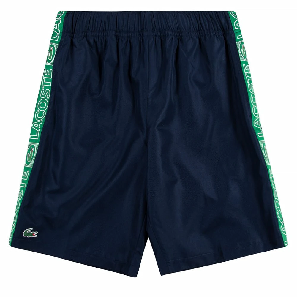 Contrasting side bands mingling crocodiles with the brand’s lettering enliven these Lacoste Sport shorts. Crafted in a lightweight diamond taffeta, the piece is lined in jersey to offer great freedom of movement. An elasticized waist completes its comfortable fit.