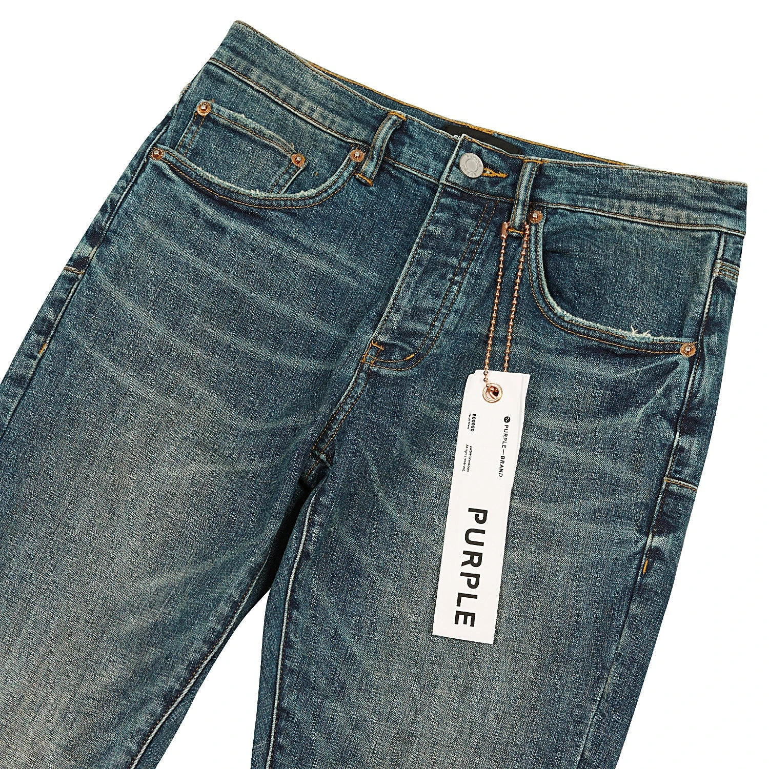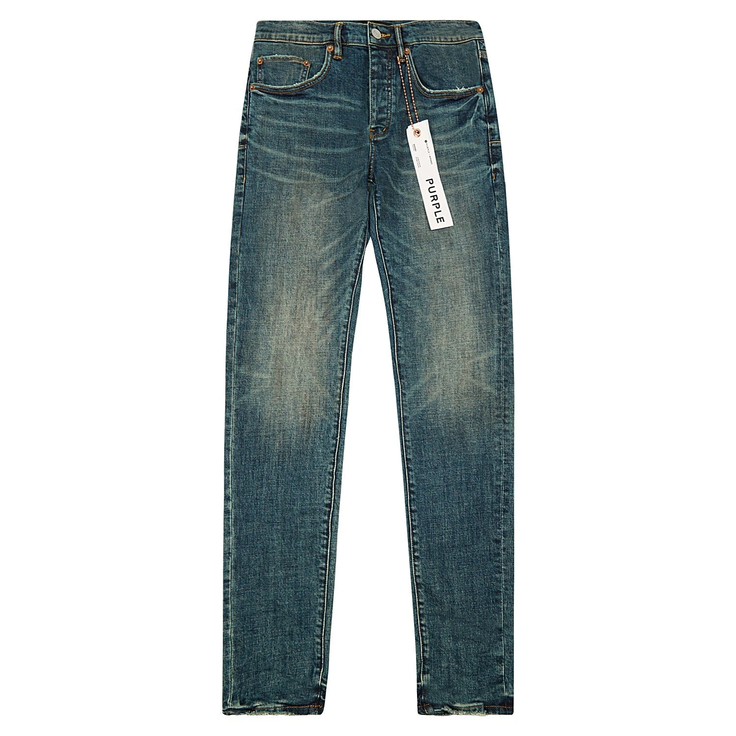 Crafted from premium stretch denim, in a dark indigo wash with faded thighs for a vintage feel, this low rise skinny features five pocket styling, reinforced belt loops, bar-tack stitching, chambray lining for a more comfortable fit, a custom Purple cowhide leather patch and signature hang tag branding.