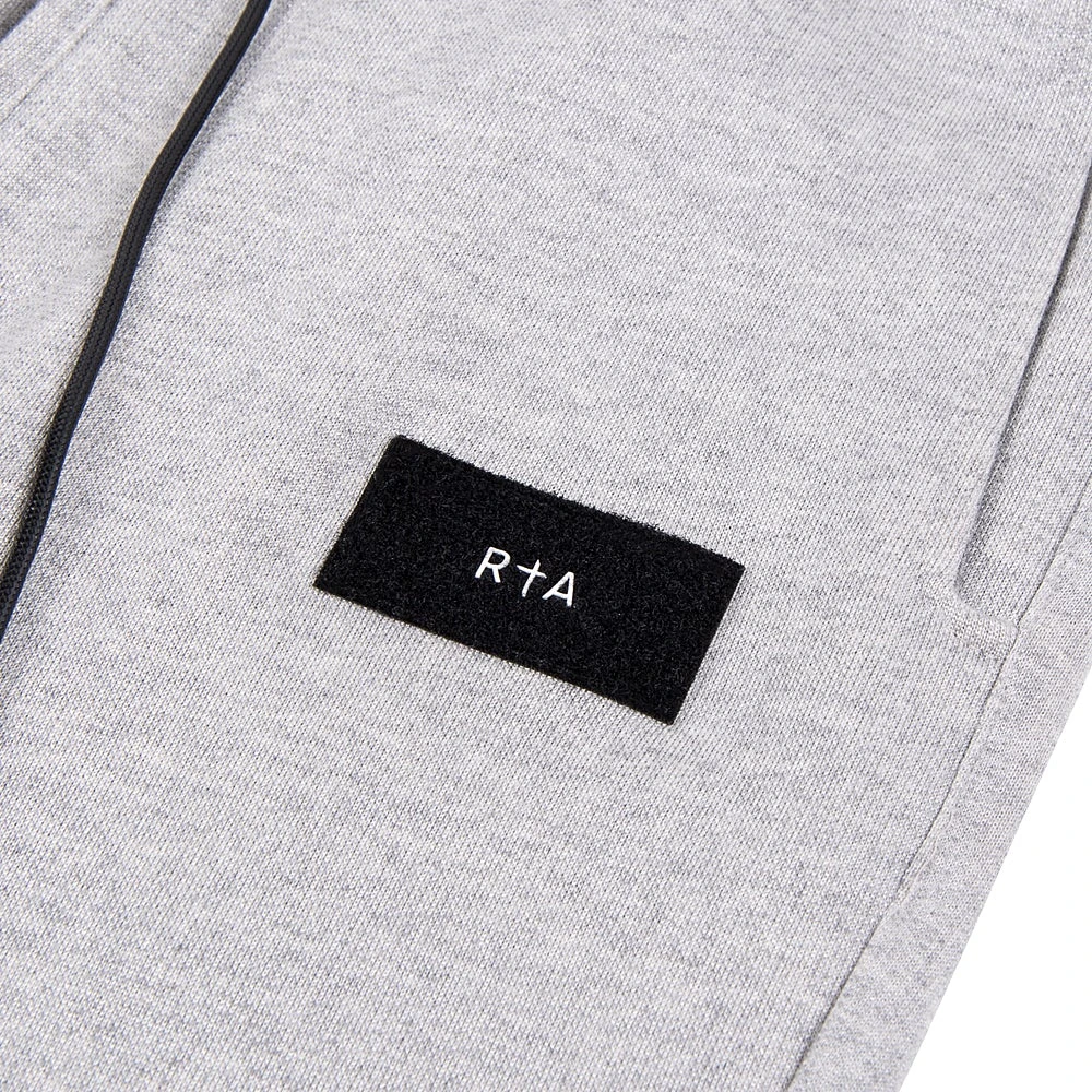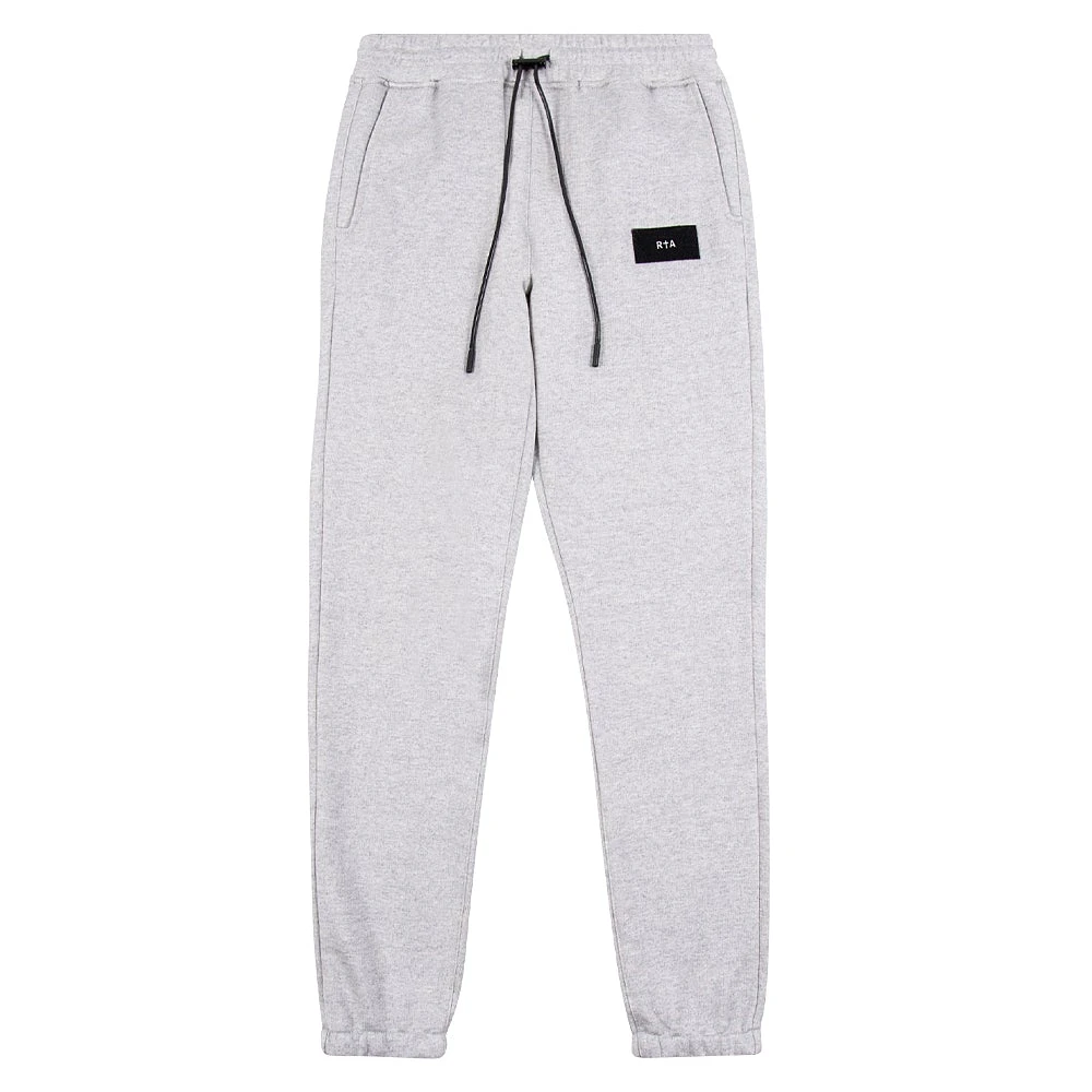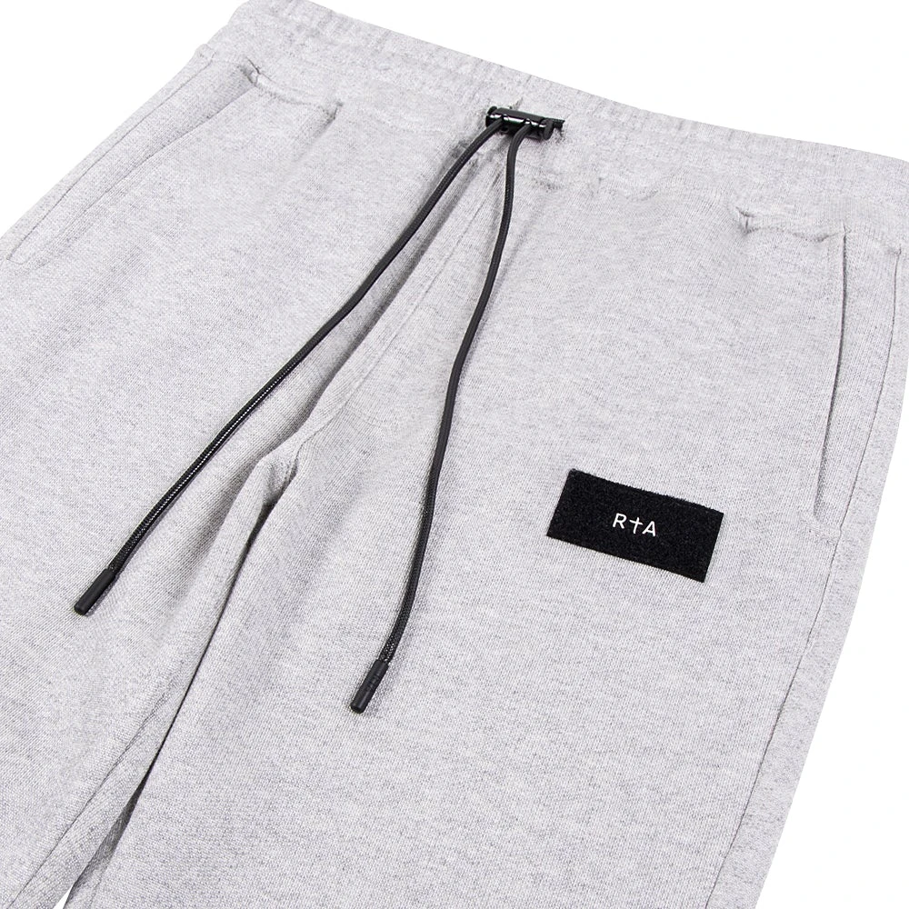 The RtA Owen Sweatpants in Light Grey feature a black velcro logo patch on the front. The relaxed silhouette offers an elasticized waist and ankle cuffs, with an RtA logo engraved toggle and wax coated drawstring.