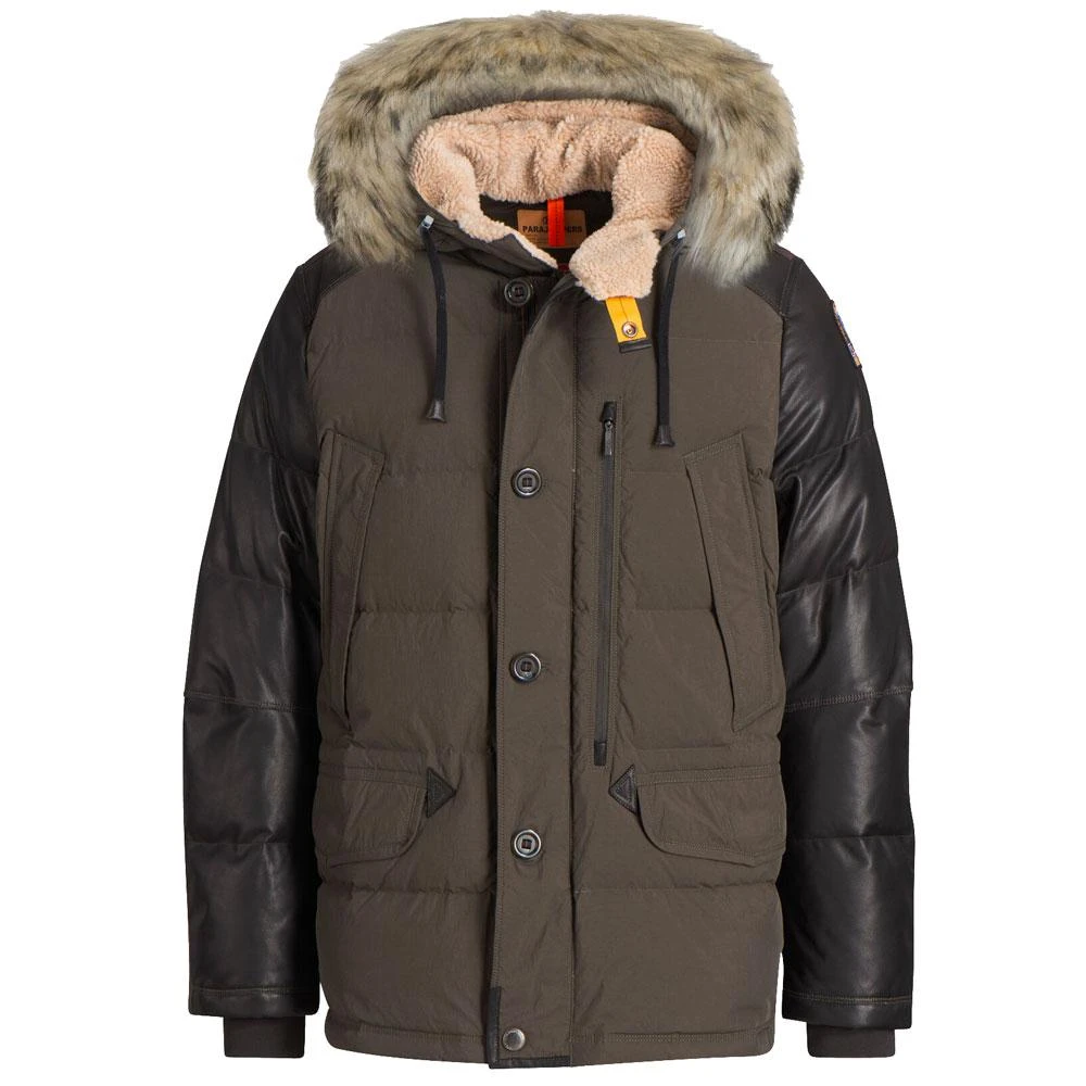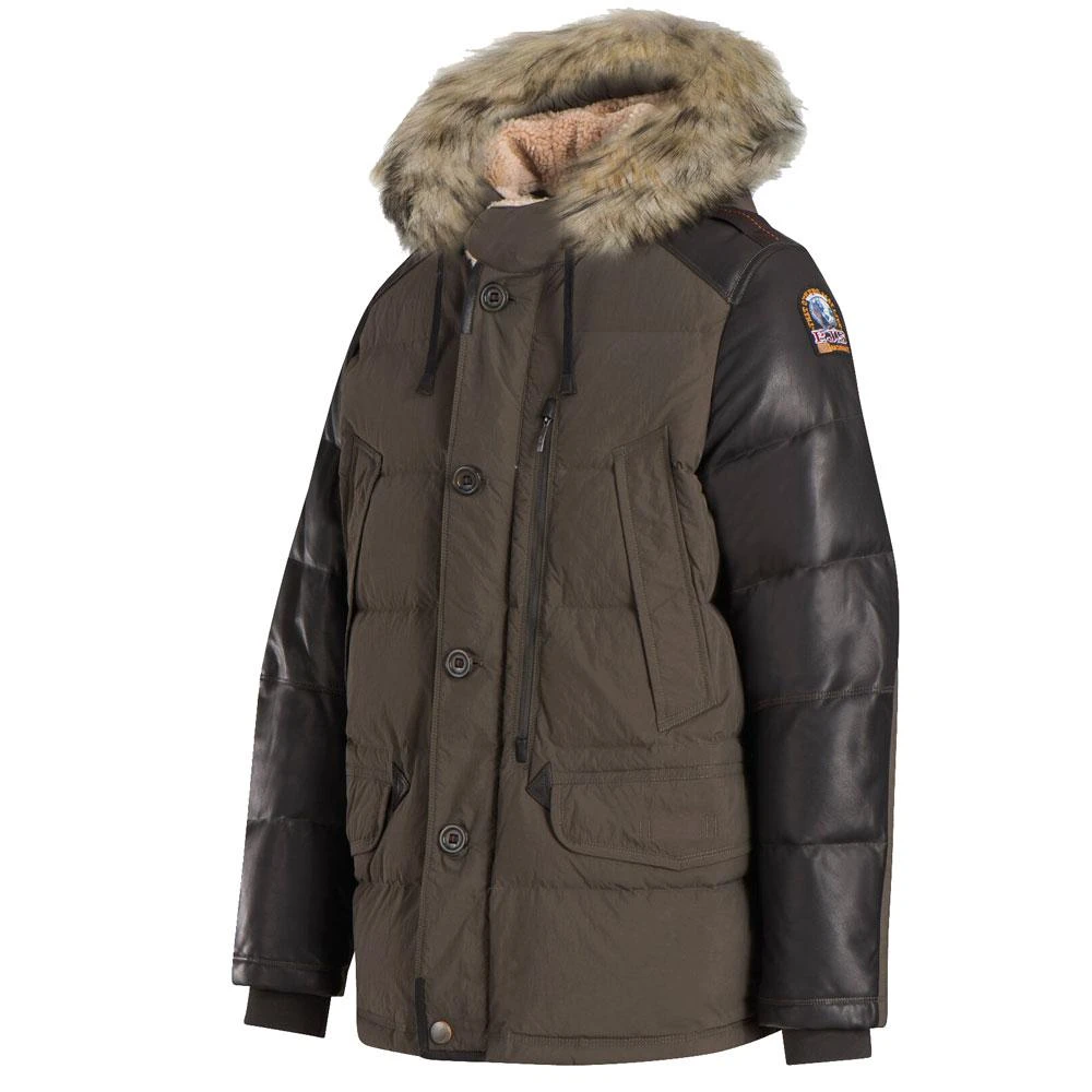 Down-filled jacket in nylon reps, combined with goatskin leather. Drawstring hood with detachable real fur trim and a faux fur lining. Multiple pockets include a capacious cargo pocket in front and two inner mesh pockets. Two-way front zip with button-up storm flap. Zippered side slits and buttons at the bottom. Elastic tape neck closure. PJS patch on the left sleeve.