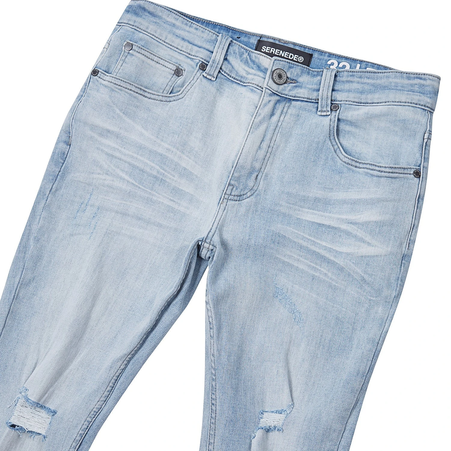 The “POTALA PALACE” denim features a light blue wash with a skinny fit. Fading, distressing, and minimal whiskering throughout. Five-pocket styling. Leather logo patch at back waistband. Zip-fly.Tonal stitching. 5 1/2″ W leg opening. SERENEDE® branded button and rivet hardware.