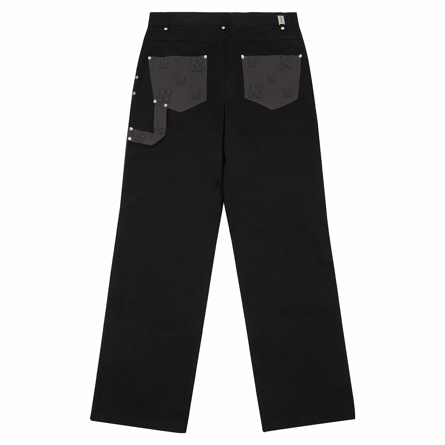 Introducing the Utility Pant in black, a trouser crafted from luxury French cotton fabric; softer than denim, but more durable than standard cotton. The Utility Pant features a baggy fit and carpenter style details, with an extra hidden zip to the right leg. The pants are finished with an initial logo to the back and metal stud hardware throughout the garment.