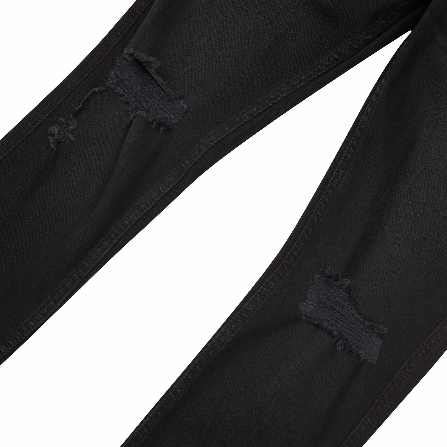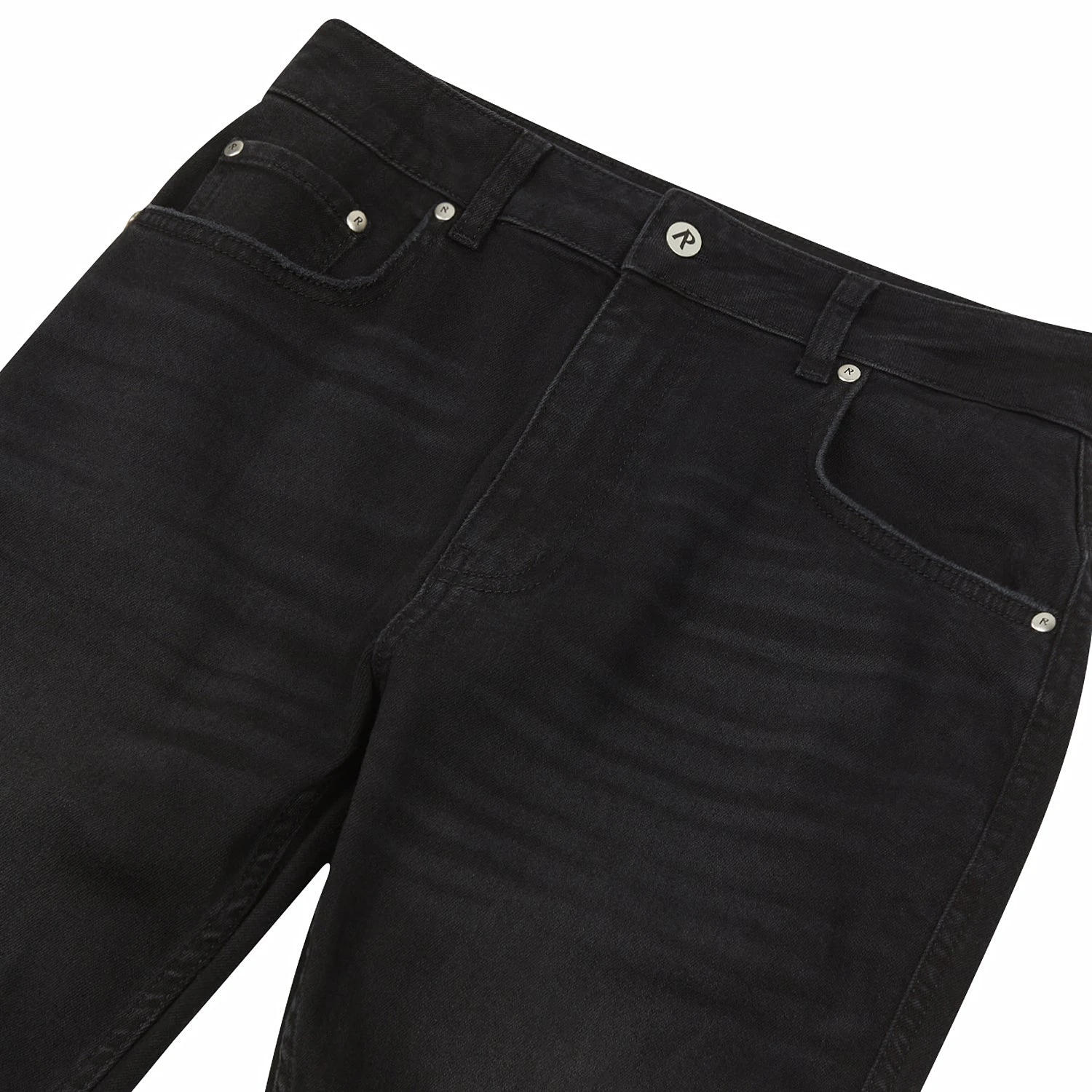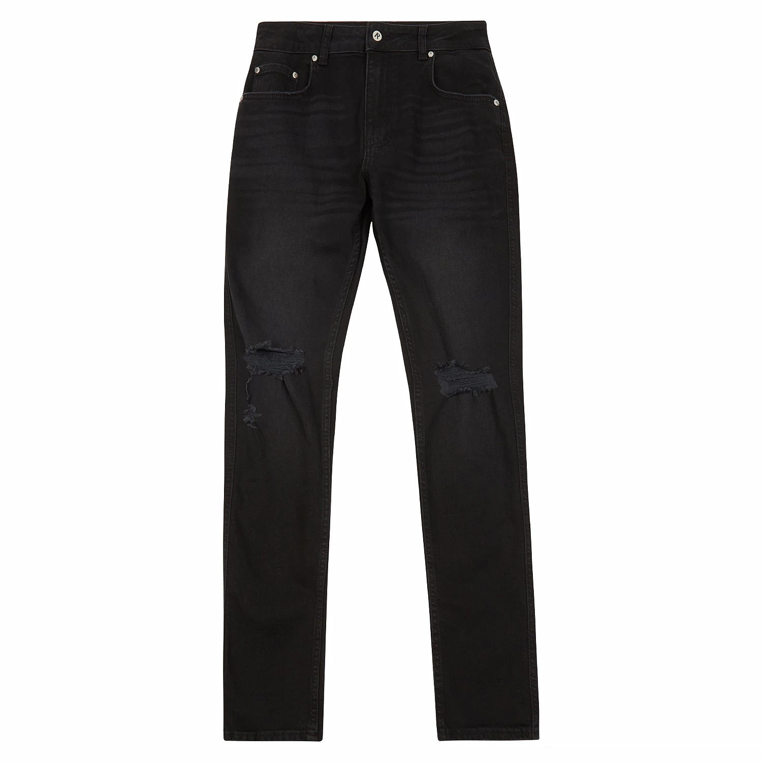 Introducing the R1 Destroyer Denim in Black. Crafted with a contemporary slim fit from a new fabric which affords a softer hand feel, these jeans are solid black in colour with minimal fade. They have an Initial branded button and rivets and rips to the knees.