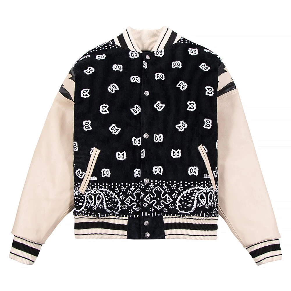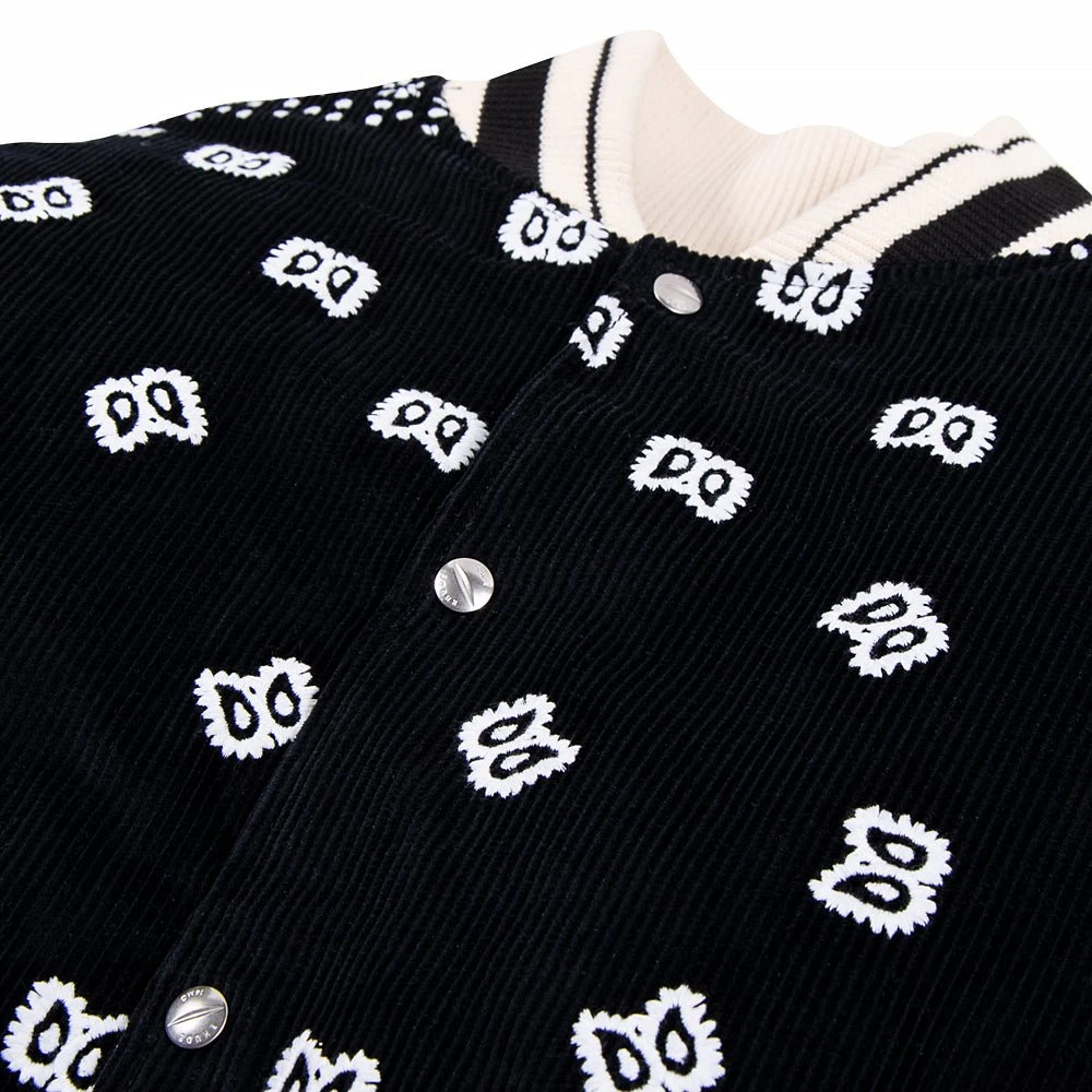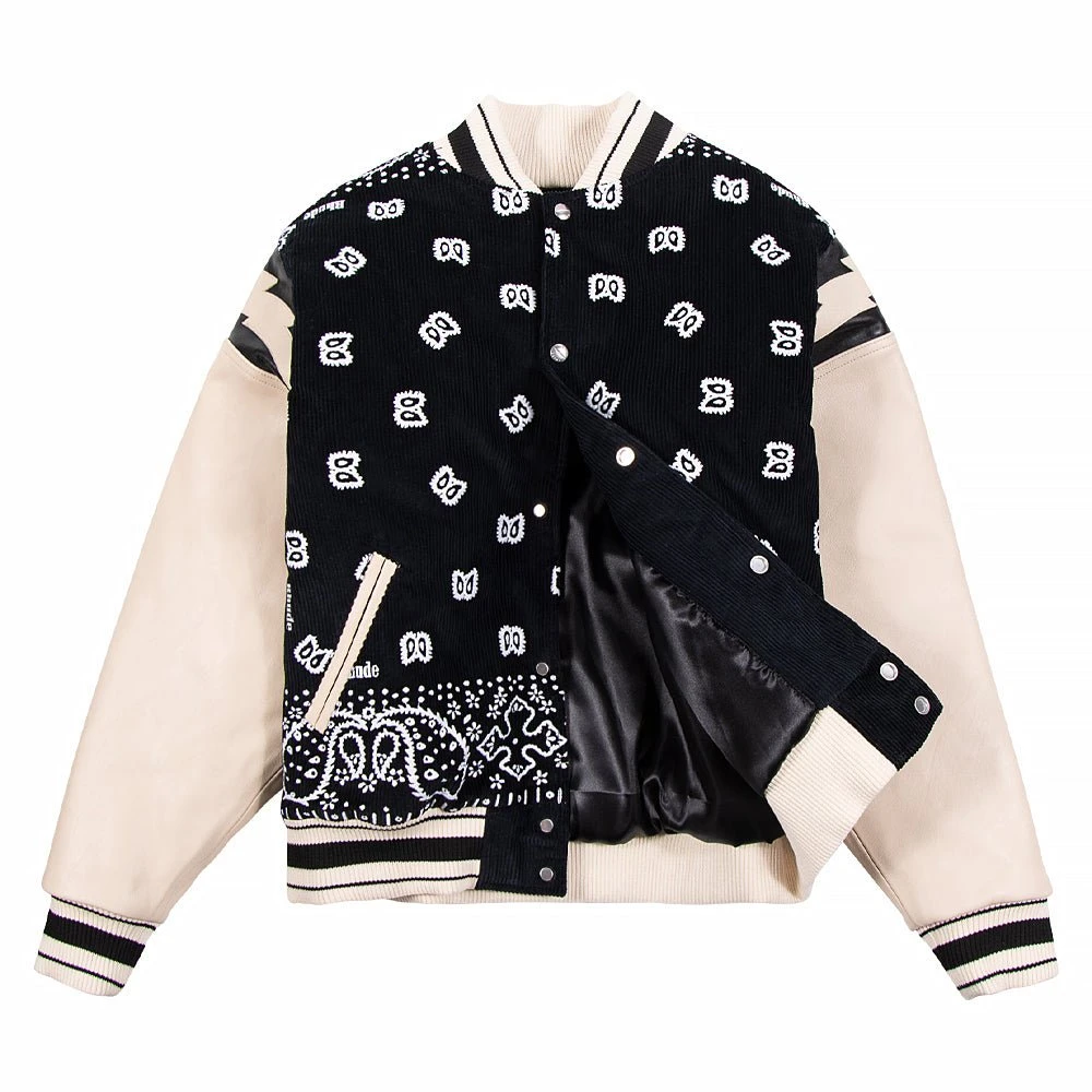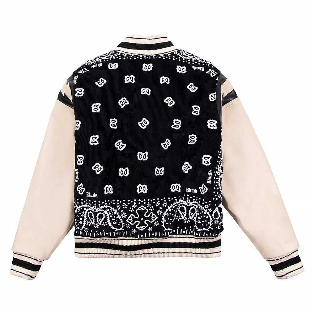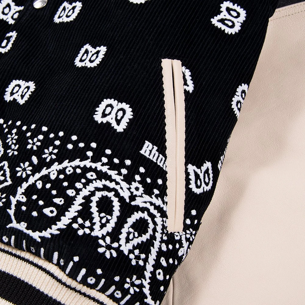 Premium Bandana Bomber Jacket in Corduroy/Creme Leather. Signature paisley and bandana embroidered throughout the jacket. Twin lightning bolt applique on each shoulder. Twin pockets at front. Custom Riri Snap Closures. Features a ribbed collar, waist, and cuffs.