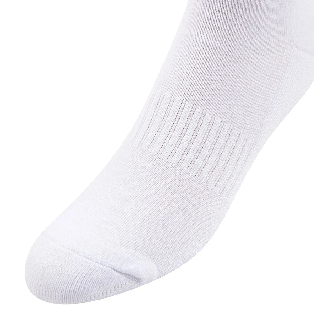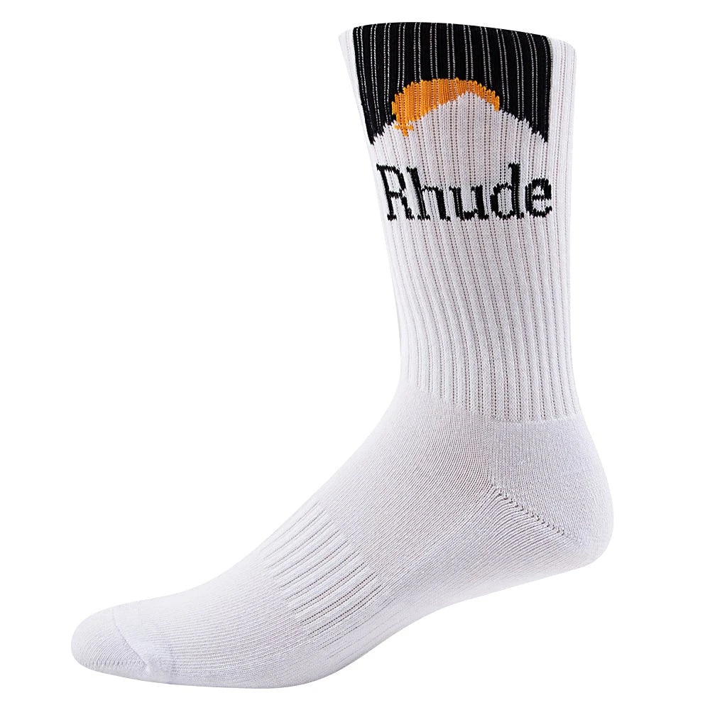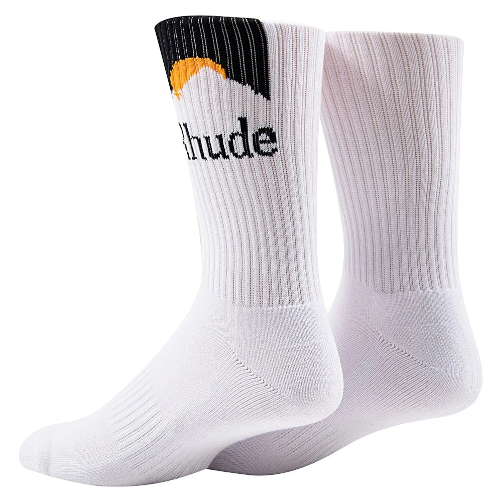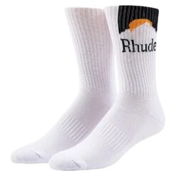 Calf-high stretch knit cotton-blend socks in white. Jacquard logo graphic in black and orange at rib knit cuffs.