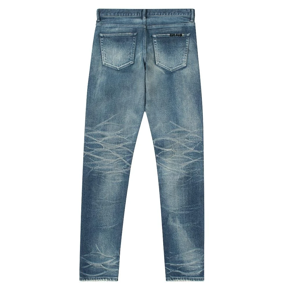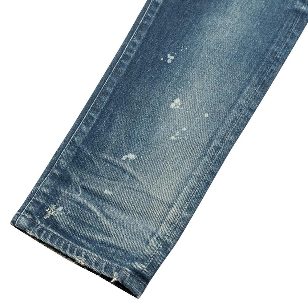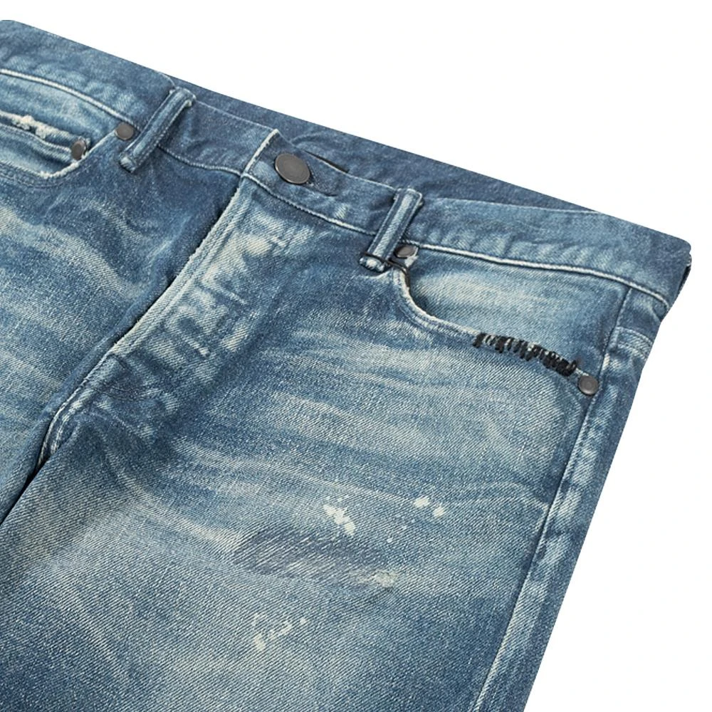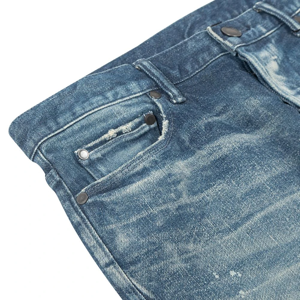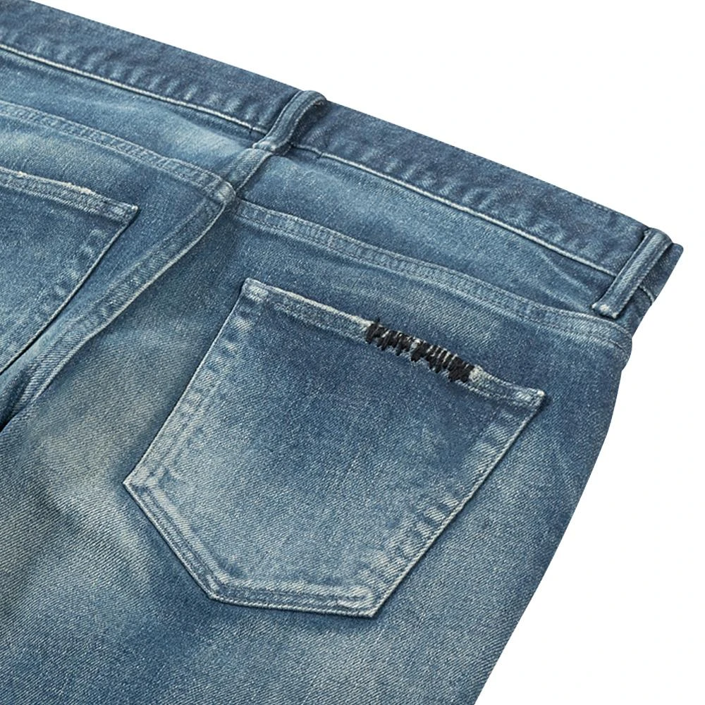 Japanese 3×1 stretch denim. Slim tapered fit with a low rise in the front and higher rise in the back. Medium indigo wash with destroys, hand-sewn repairs, and paint details. 3D whiskers on the thighs, knees, and ankles gives the appearance of worn-in creases you’d find on a pair of your favorite broken-in jeans. The distressing on these jeans is unique to each pair. Tonal stitching. Button fly. Made in Japan.