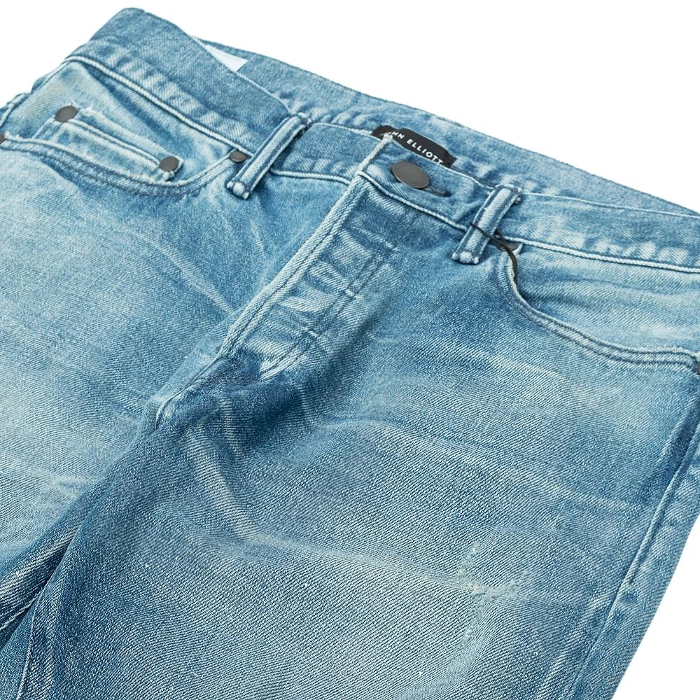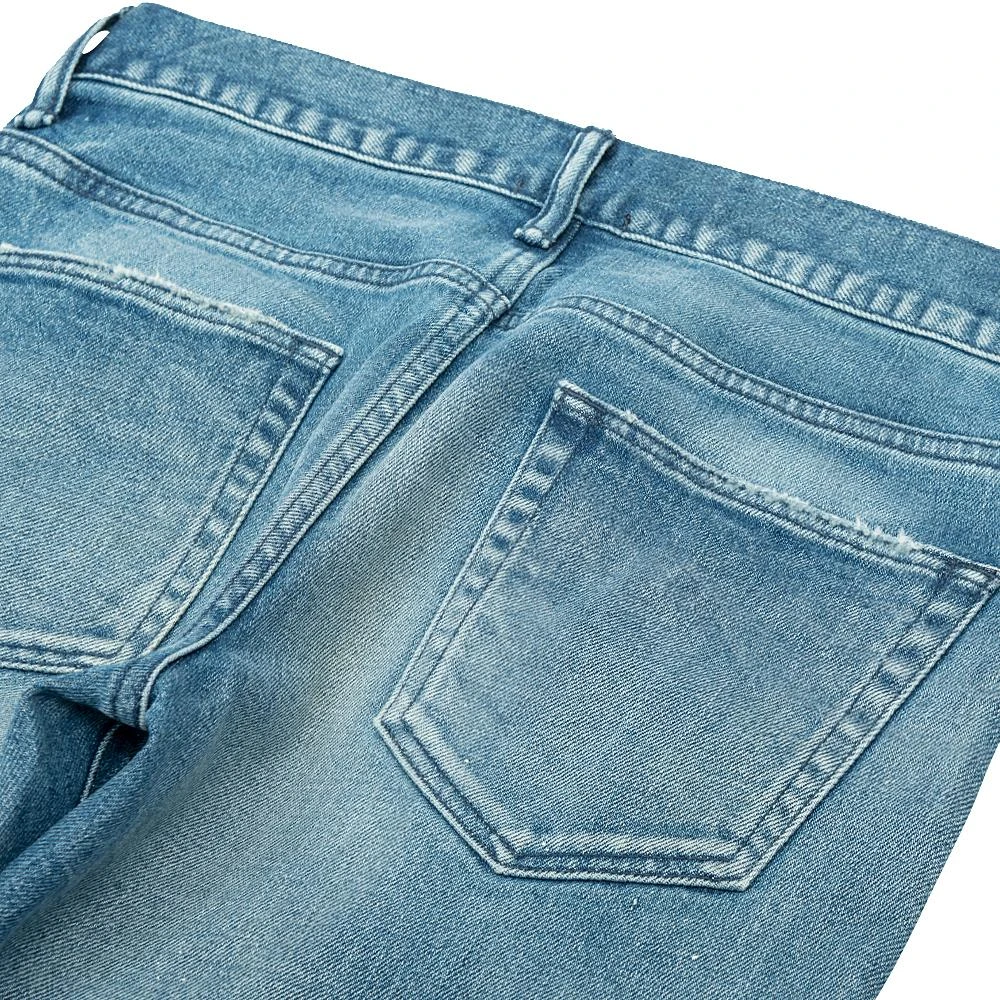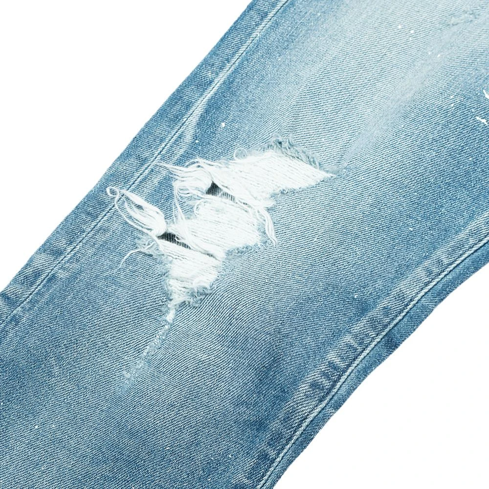 Japanese 3×1 stretch denim. Slim tapered fit with a low rise in the front and higher rise in the back. Light indigo finish with vintage-inspired repairs and distressing throughout. Made in Japan.