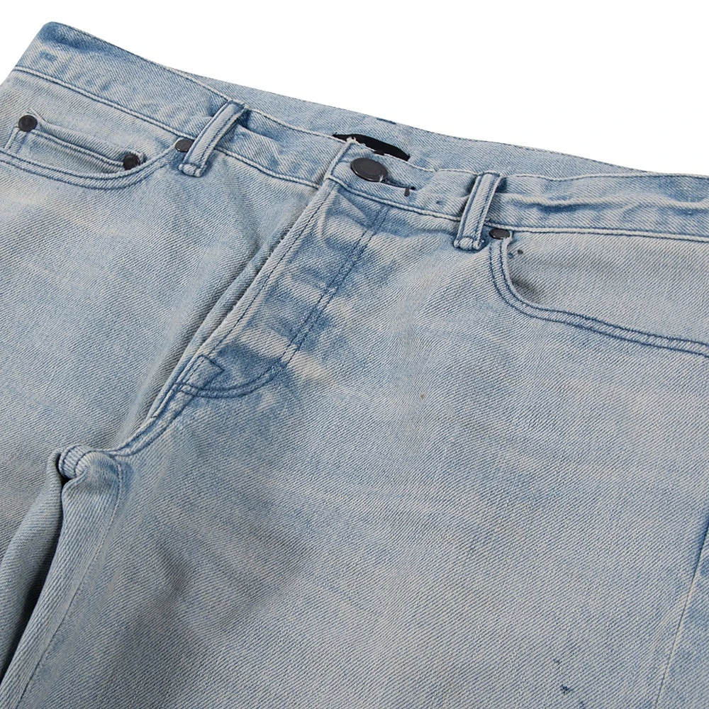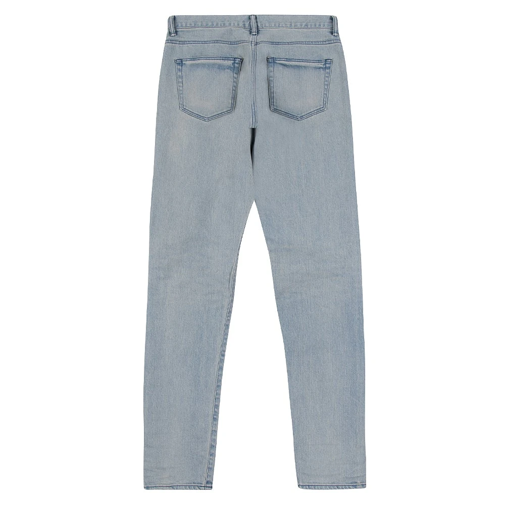 Japanese dry process 3×1 stretch denim in faded indigo. Slim tapered fit with a low rise in the front and higher rise in the back.