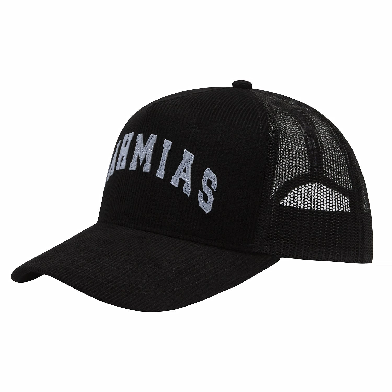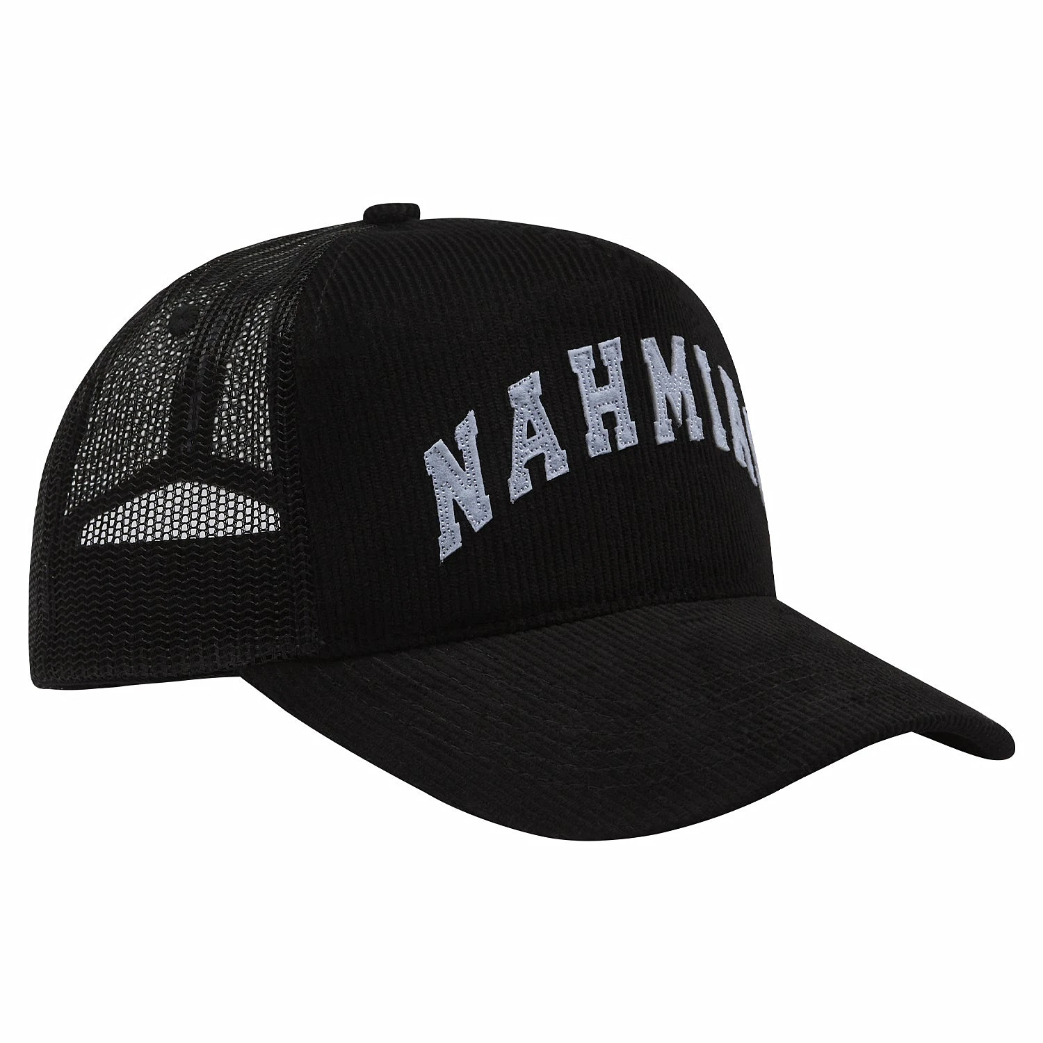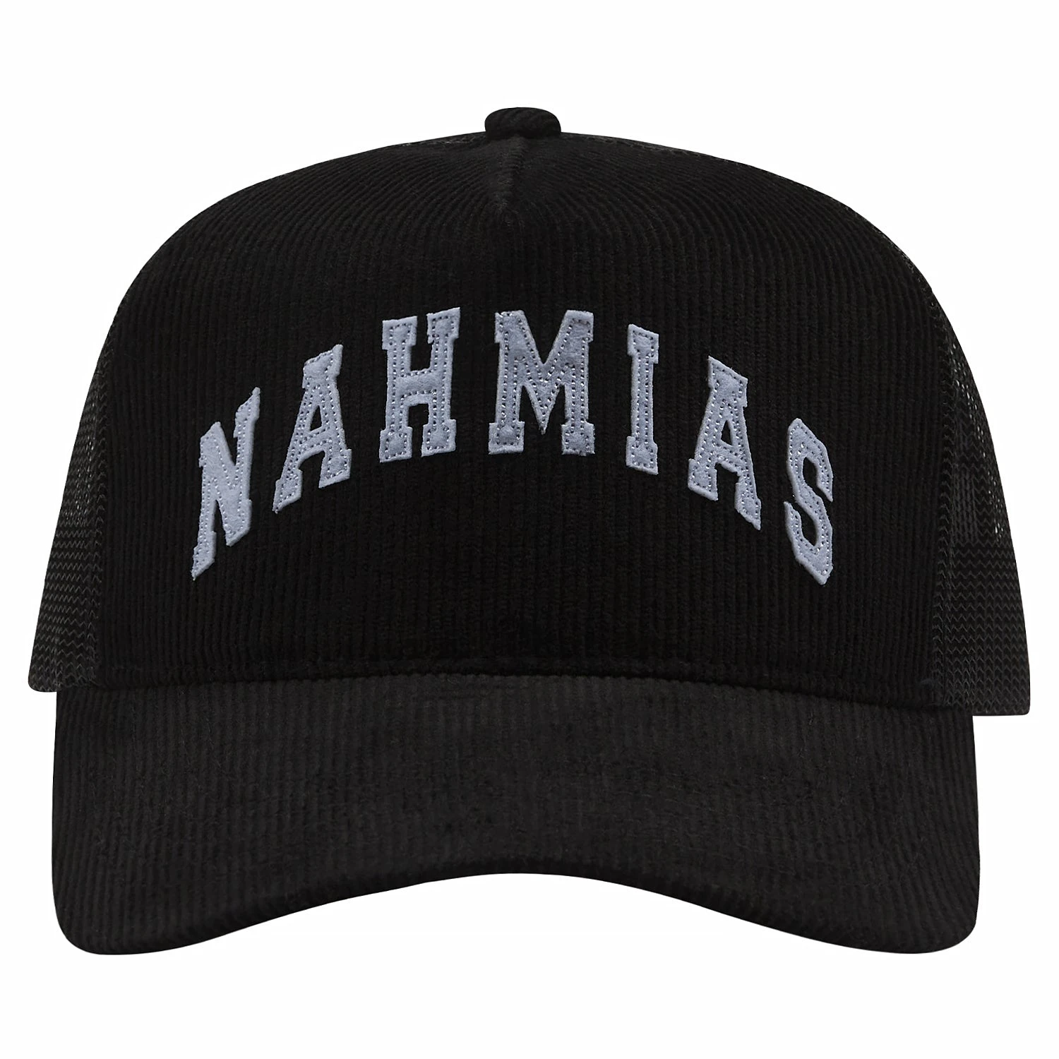 BLACK CORDUROY TRUCKER HAT WITH NAHMIAS VARSITY MOTIF